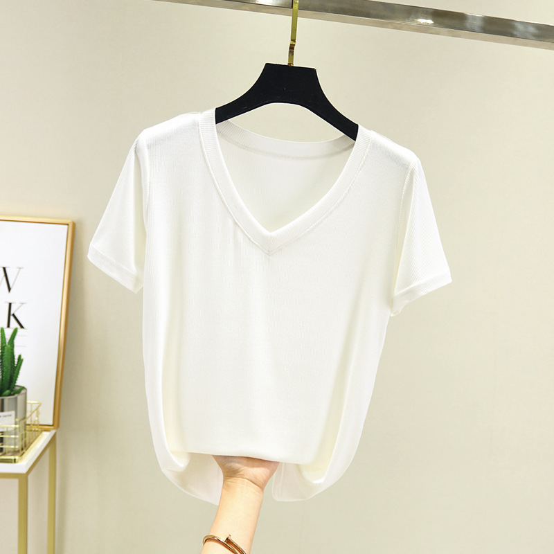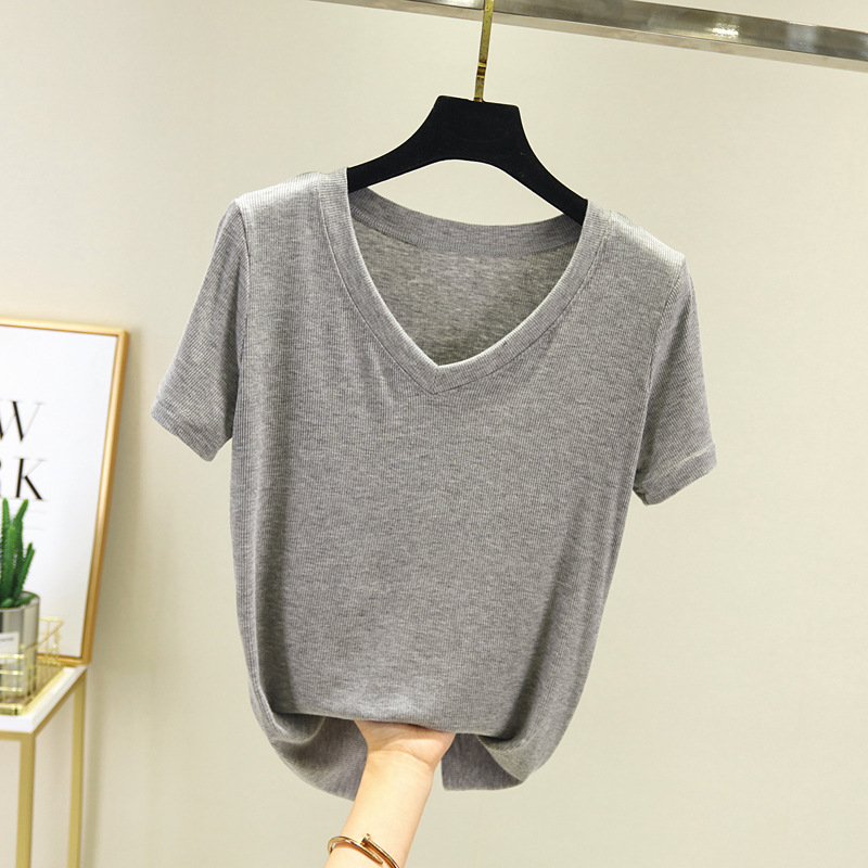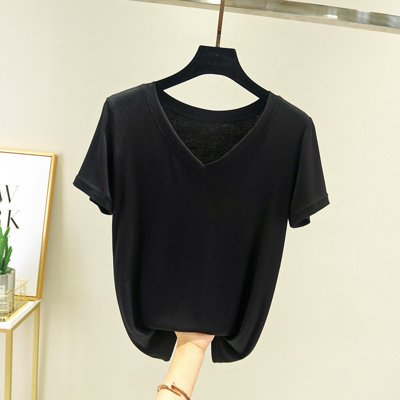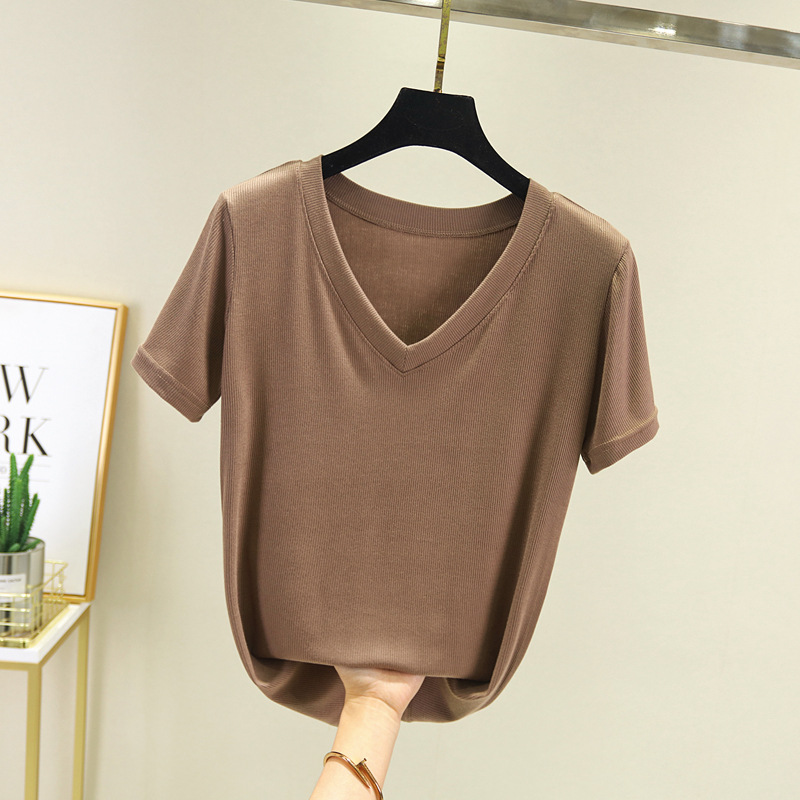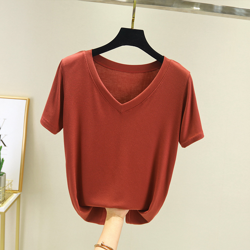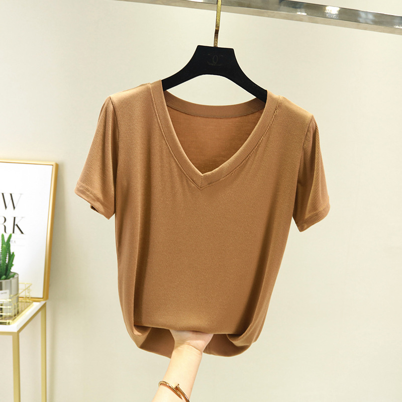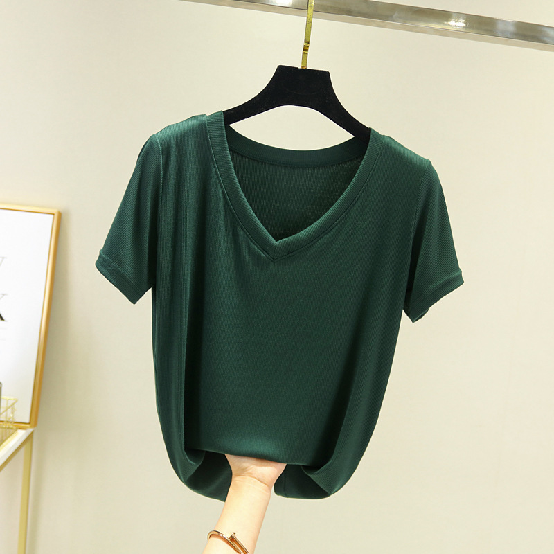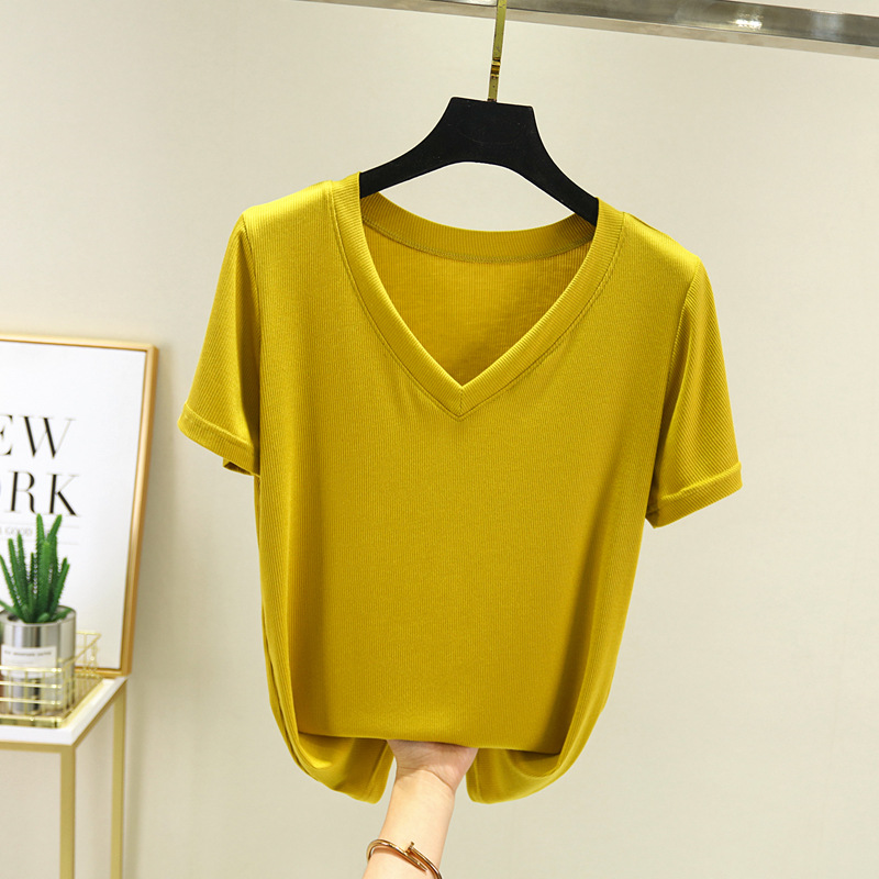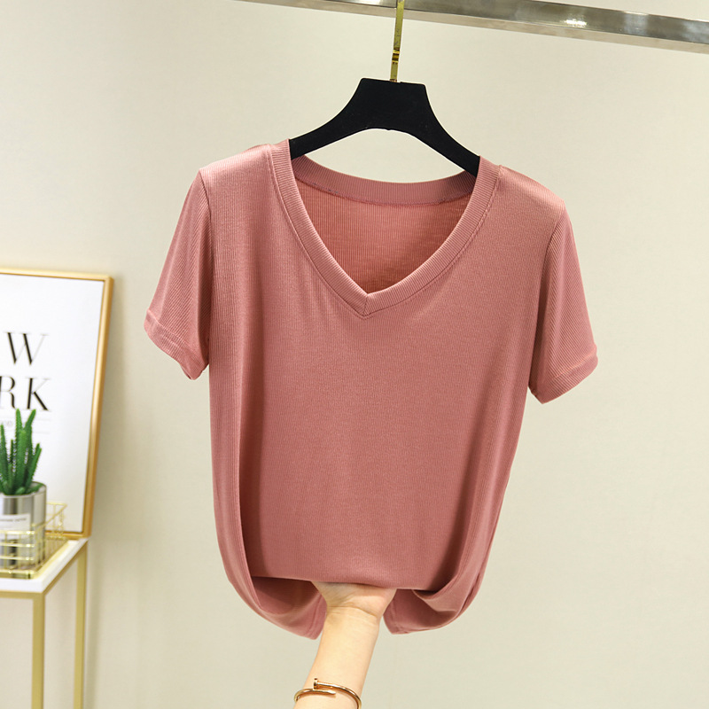 스레드 반팔 티셔츠 여성용 여름 웨스턴 스타일 올매치 슬리밍 브이넥 탑 캐주얼 마스크 모달 베이스 셔츠 트렌디