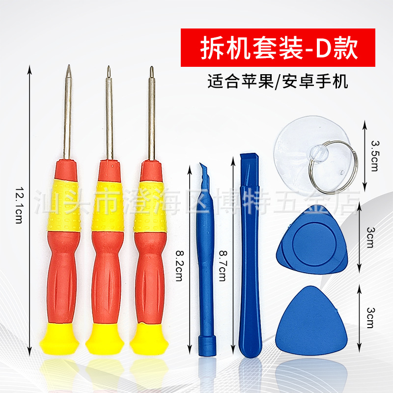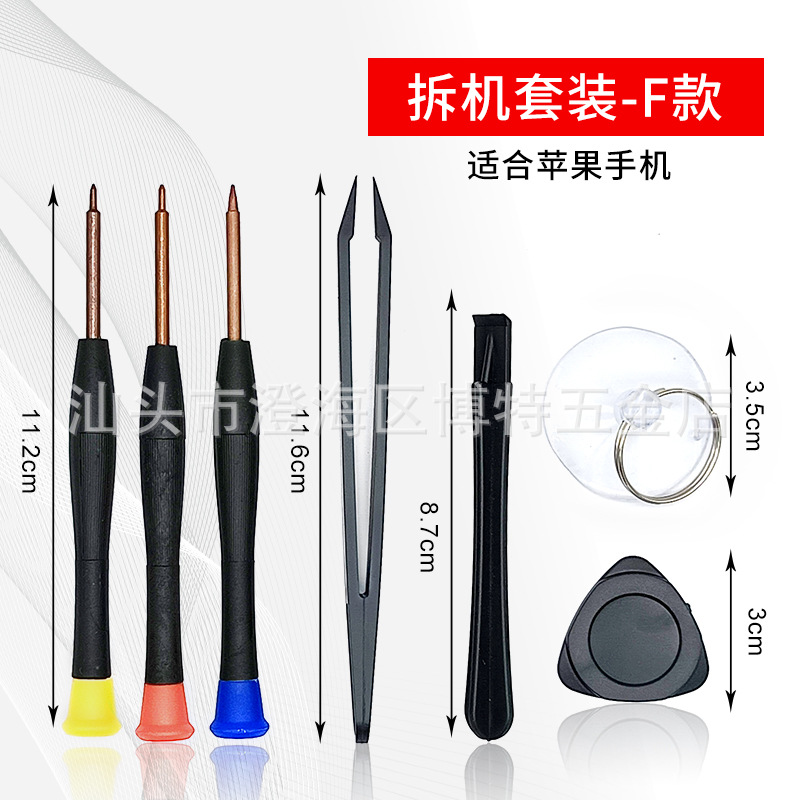 苹果拆机8件套(可拆苹果全系列手机)一套包含:1.5十字螺丝刀1把.0.8五星螺丝刀1把.0.6Y型螺丝刀1把..撬机棒2根.三角片2片.3.5吸盘一个.