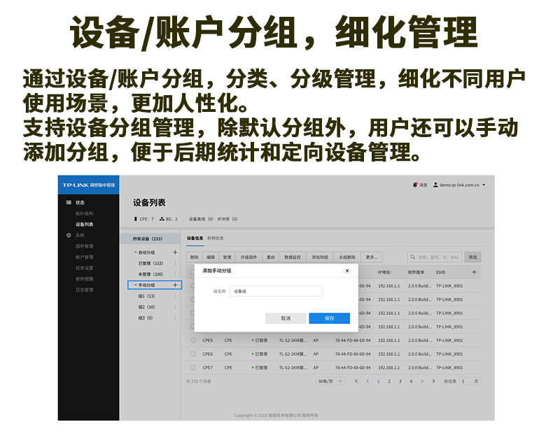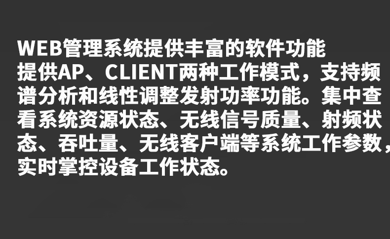 提供AP、Client两种工作模式,支持频谱分析和线性调整发射功率功能。集中查看系统资源状态、无线信号质量、射频状态、吞吐量、无线客户端等系统工作参数,实时掌控设备工作状态。