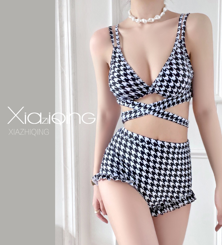 노래 Zhiya 같은 스타일 싱글 지옥입니다 섹시 수제 온천 담그기 하이 웨이스트 Houndstooth 분할 수영복 여성용 비키니스토어 가기