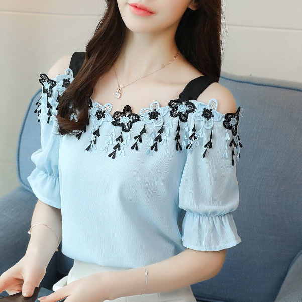 여름 쉬폰 탑 여성용 오프숄더 슬링 한국 신상품 여성용 오프숄더 반팔 세련된 슬림핏 루즈한 베이스 셔츠
