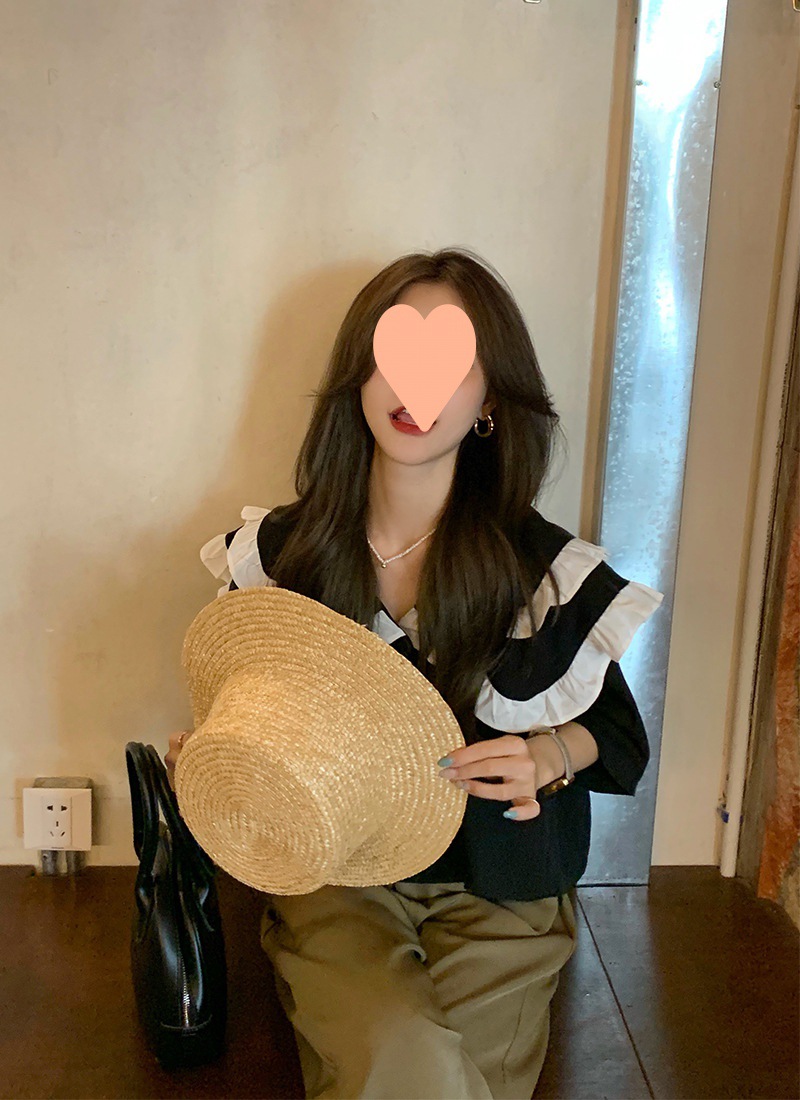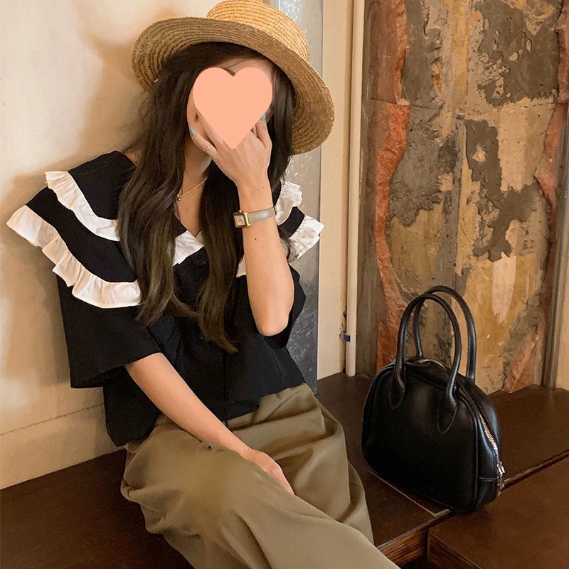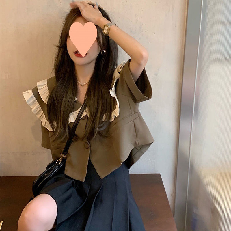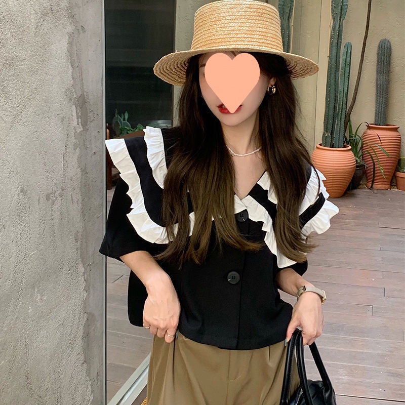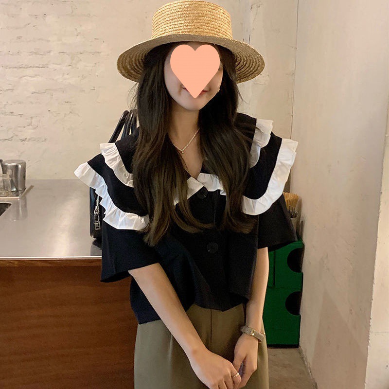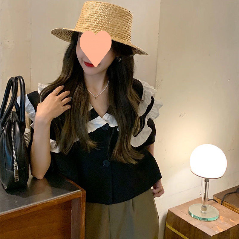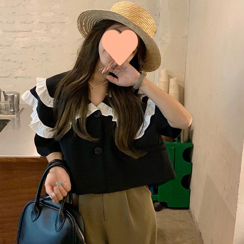 여성을위한 인형 칼라 더블 레이어 반팔 셔츠 여름 2025 새로운 프랑스 디자인 쉬폰 짧은 셔츠스토어 가기