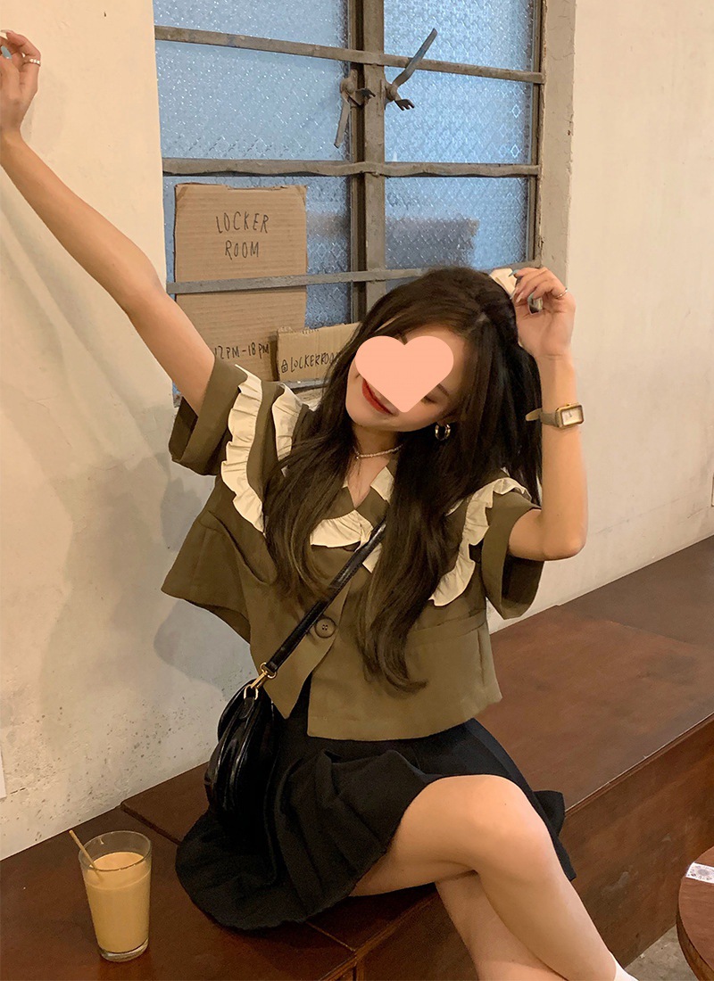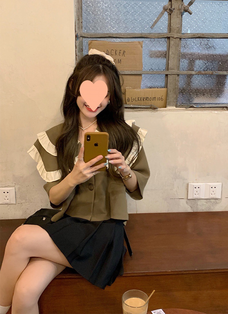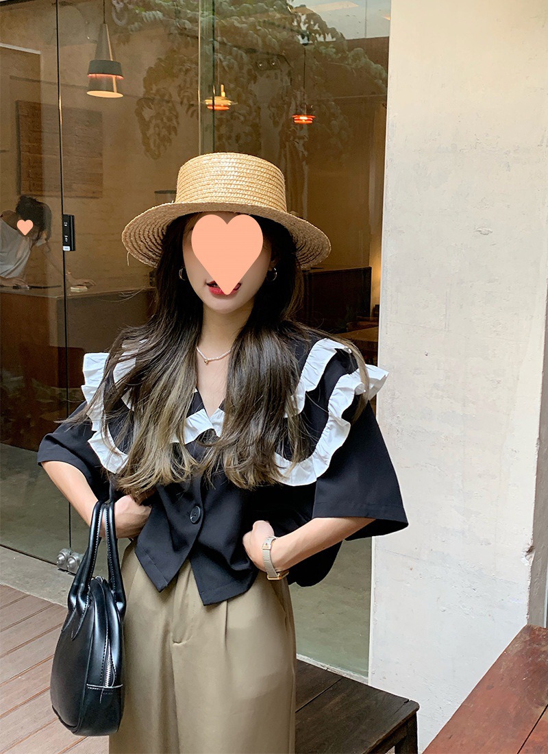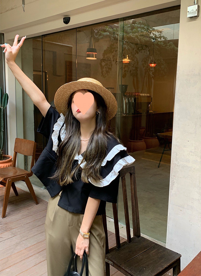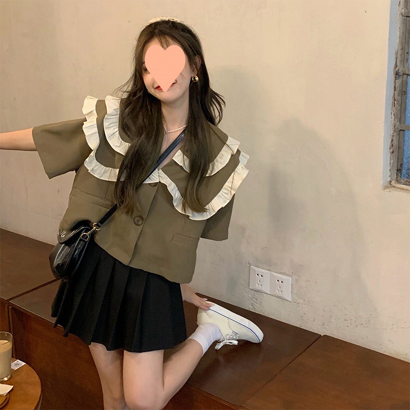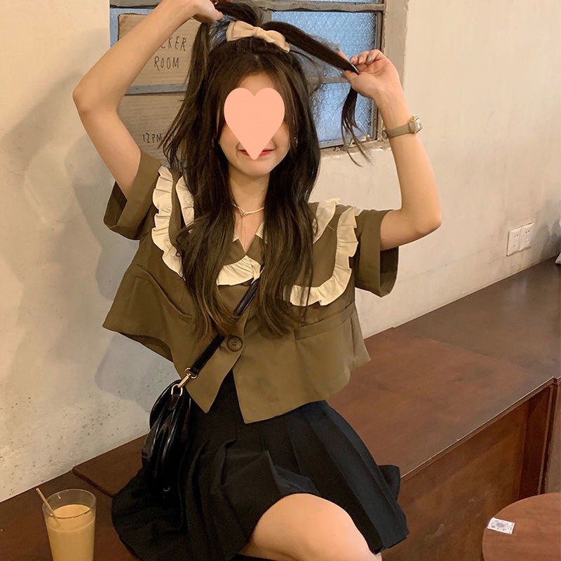 여성을위한 인형 칼라 더블 레이어 반팔 셔츠 여름 2025 새로운 프랑스 디자인 쉬폰 짧은 셔츠스토어 가기