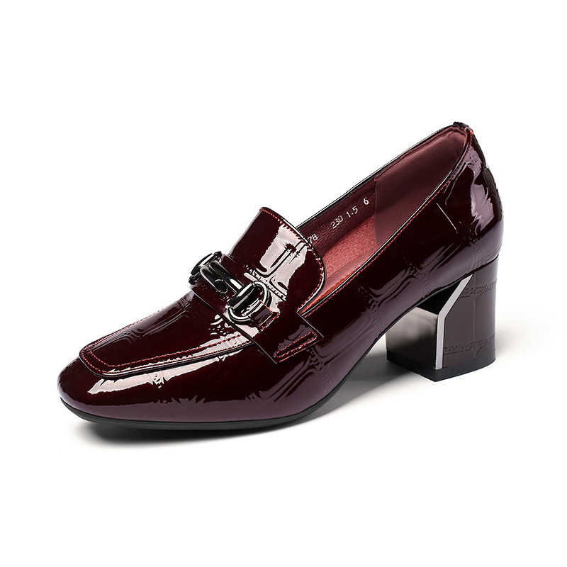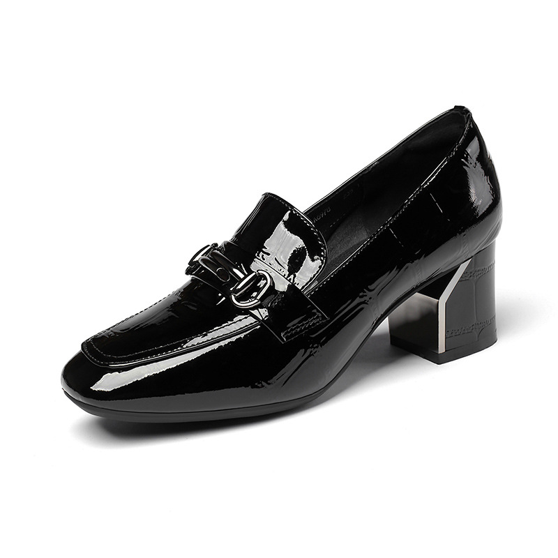 봄과 가을 새로운 Cowhide 두꺼운 부드러운 밑바닥 광장 발가락 특허 가죽 여성 싱글 레이어 신발 한국 스타일 슬립 온 하이힐 가죽 신발 대형스토어 가기