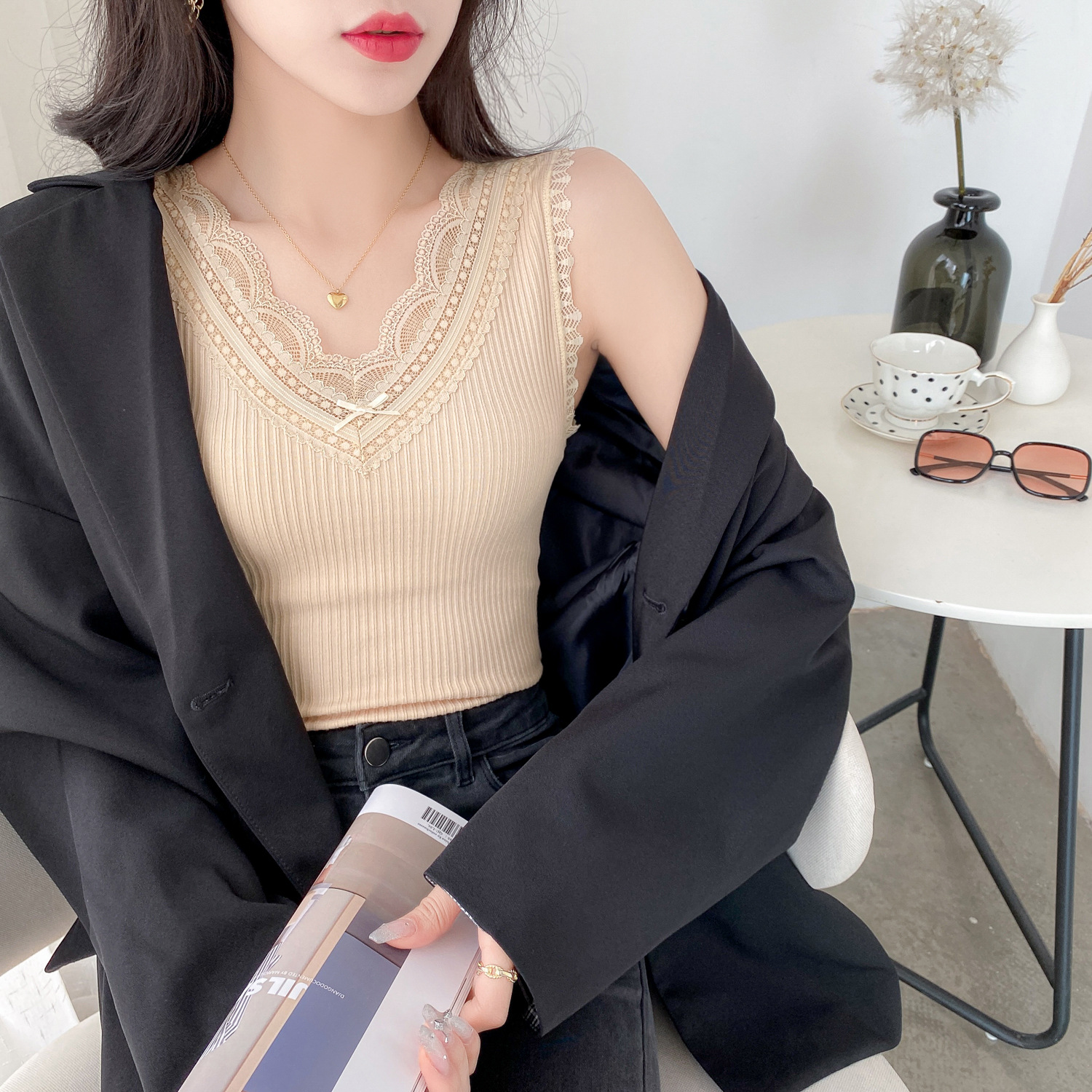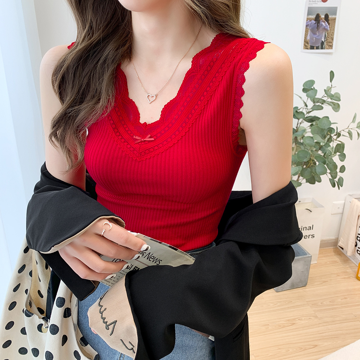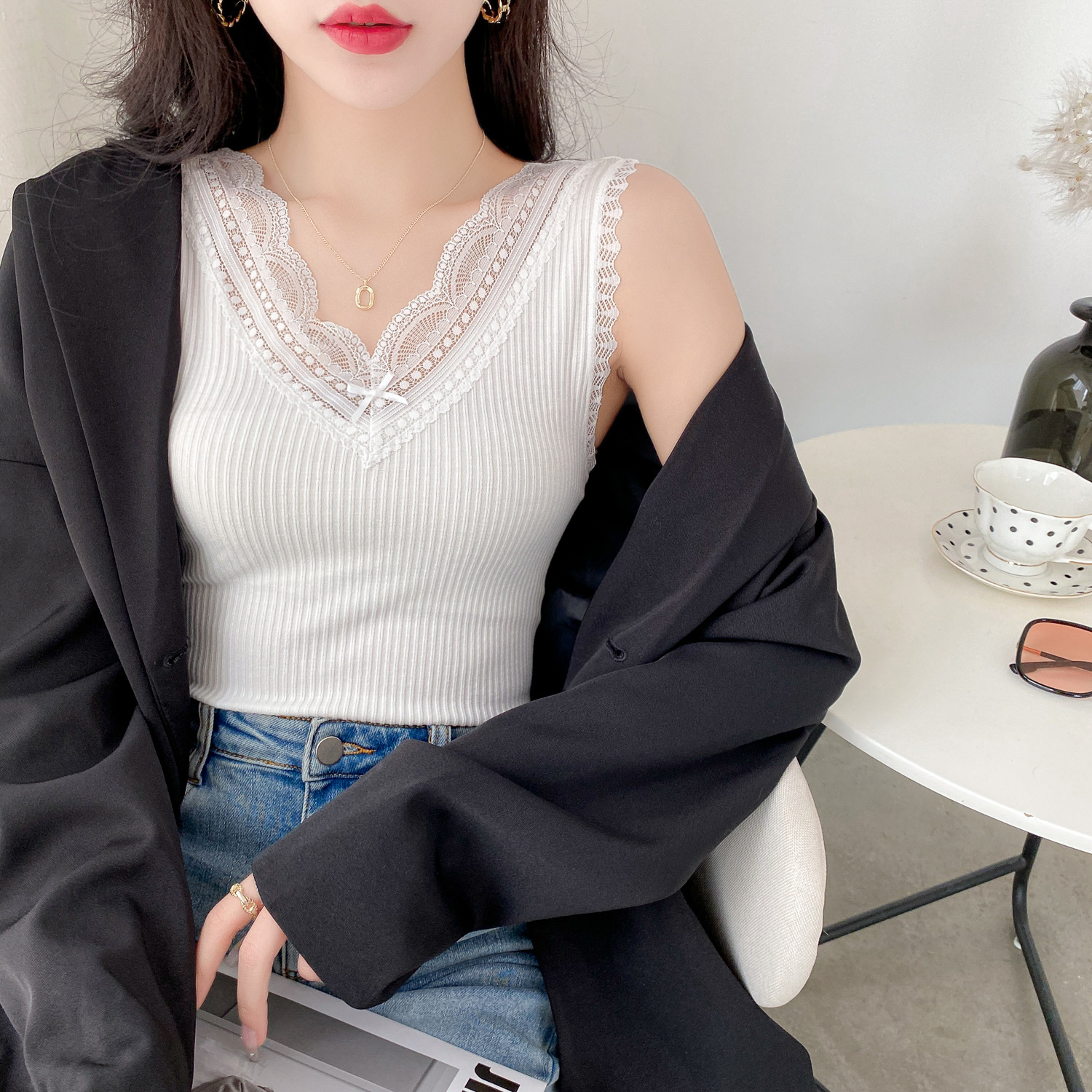 슬링 하트 여성용 여름 달콤한 레이스 V-넥 스티치 와이드 숄더 새로운 모든 매치 슬림 핏 민소매 탑 베이스 셔츠스토어 가기