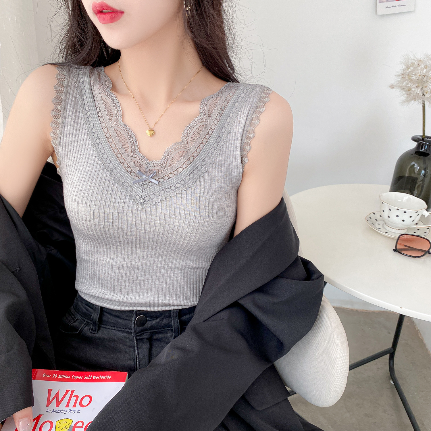 슬링 하트 여성용 여름 달콤한 레이스 V-넥 스티치 와이드 숄더 새로운 모든 매치 슬림 핏 민소매 탑 베이스 셔츠