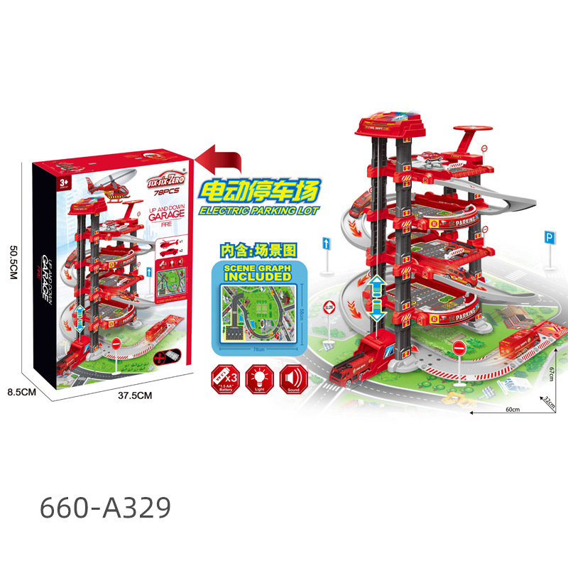 660-A329灯光+音乐 多功能四层消防升降停车场套装(配2合金车、1合金飞机 1灯塔,1路标、1环保地图58x78cm)78pcs | 开窗盒 | 37.5X8.5X50.5cm | 16 | 72.5X40.5X107cm | 33/30kg | 0.31 | 1.875kg |