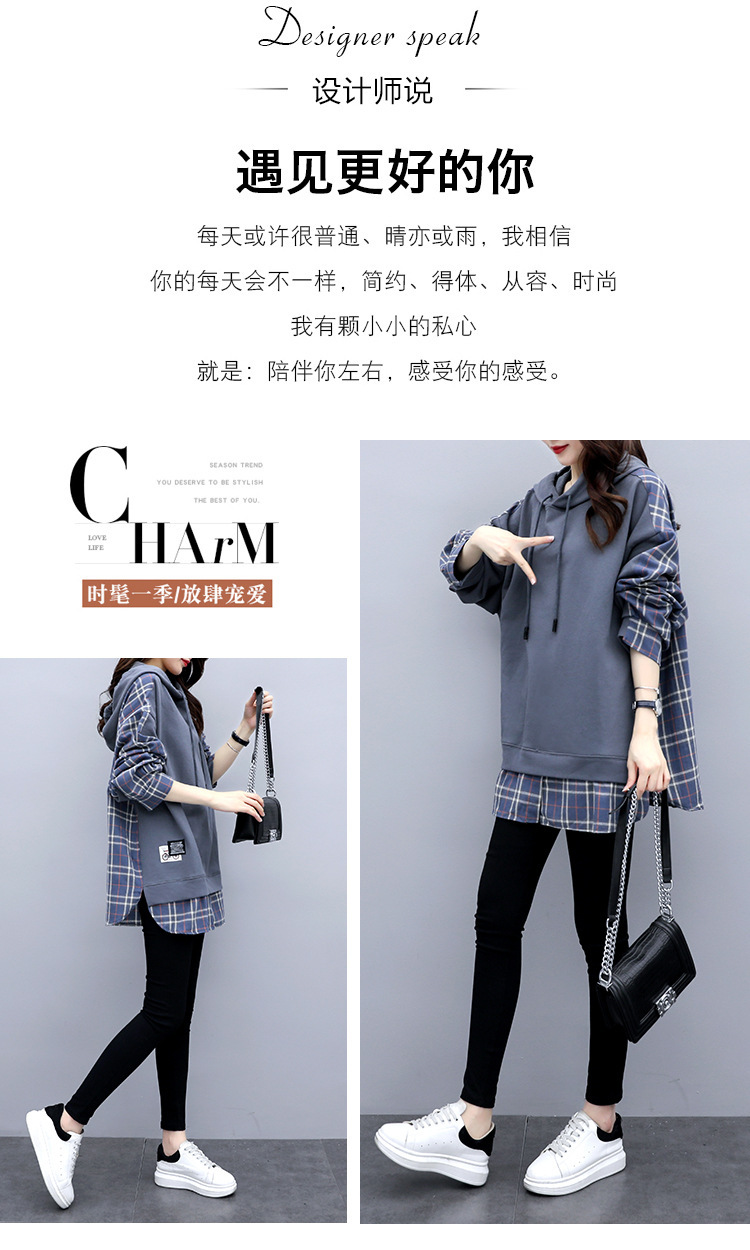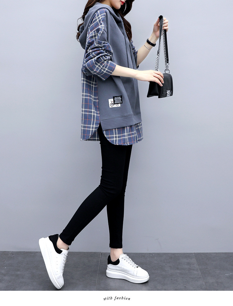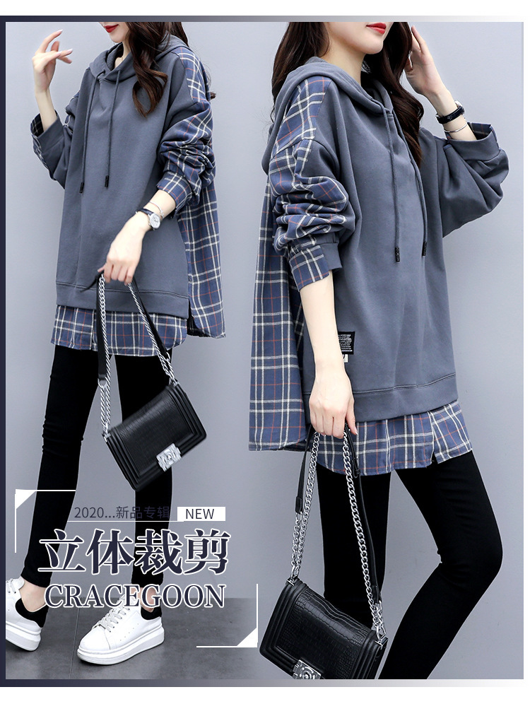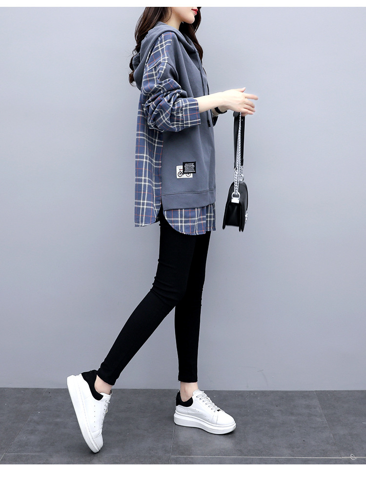 체크무늬 스플라이스 페이크 투피스 긴팔 스웨트셔츠 여성용 2026년 신상 봄옷 루즈핏 후드 미디기장 티셔츠 탑
