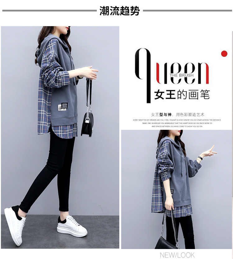 체크무늬 스플라이스 페이크 투피스 긴팔 스웨트셔츠 여성용 2026년 신상 봄옷 루즈핏 후드 미디기장 티셔츠 탑스토어 가기
