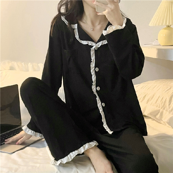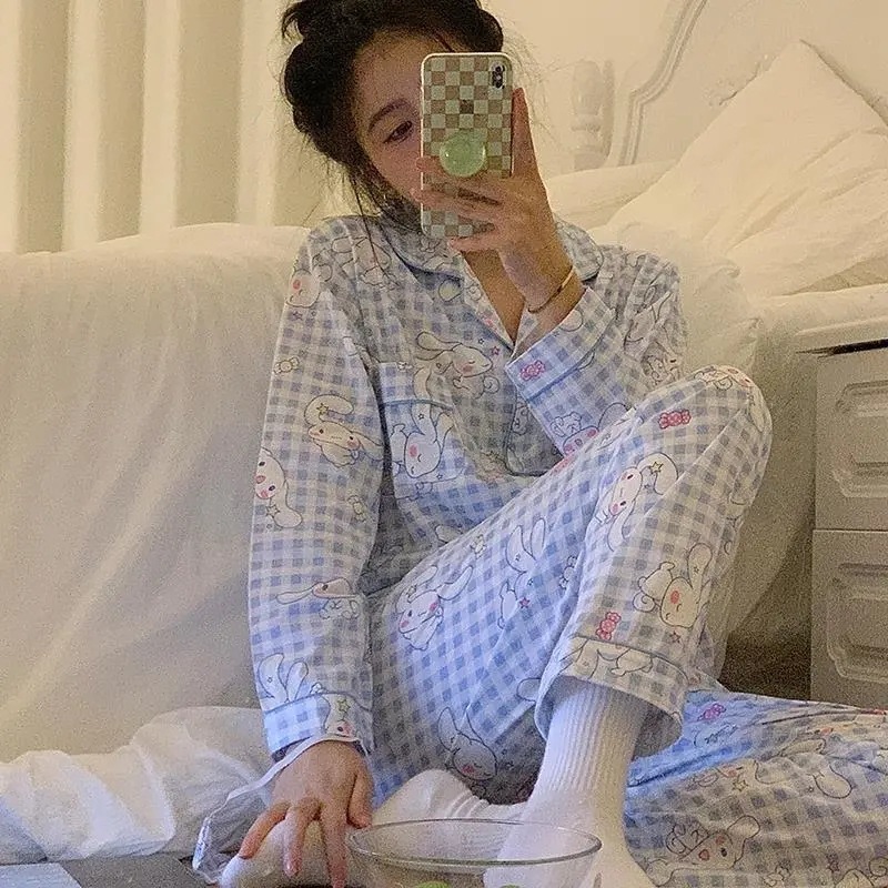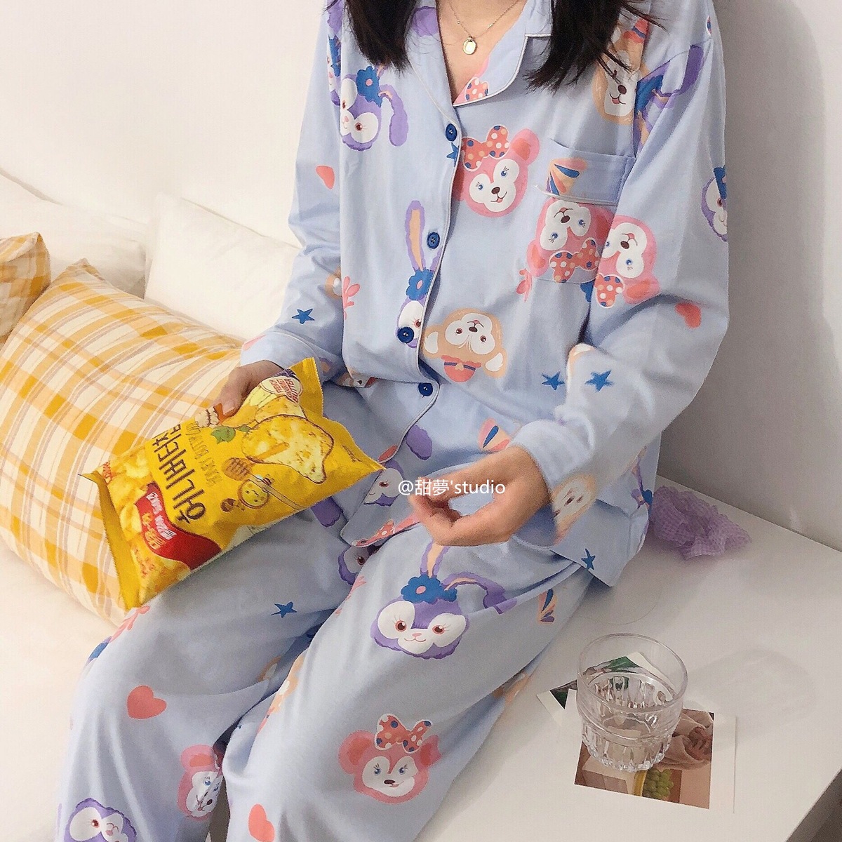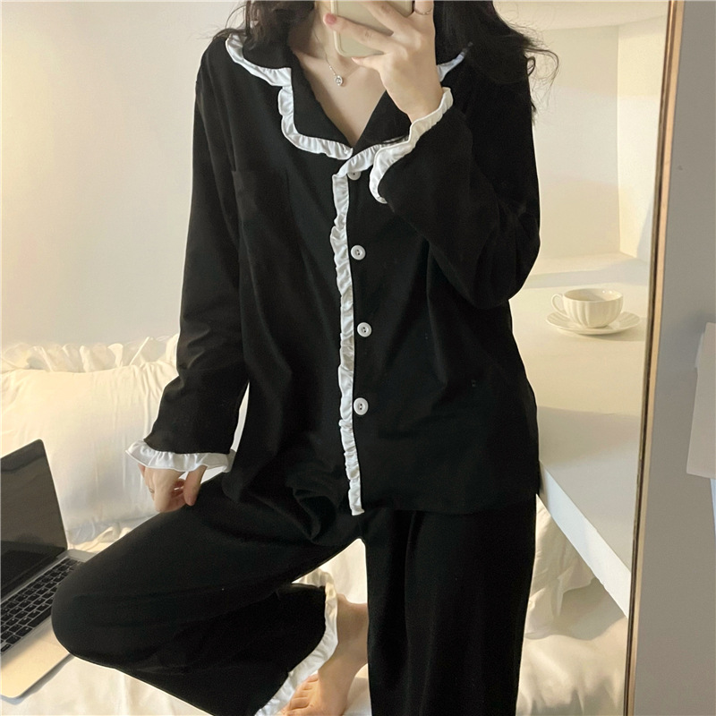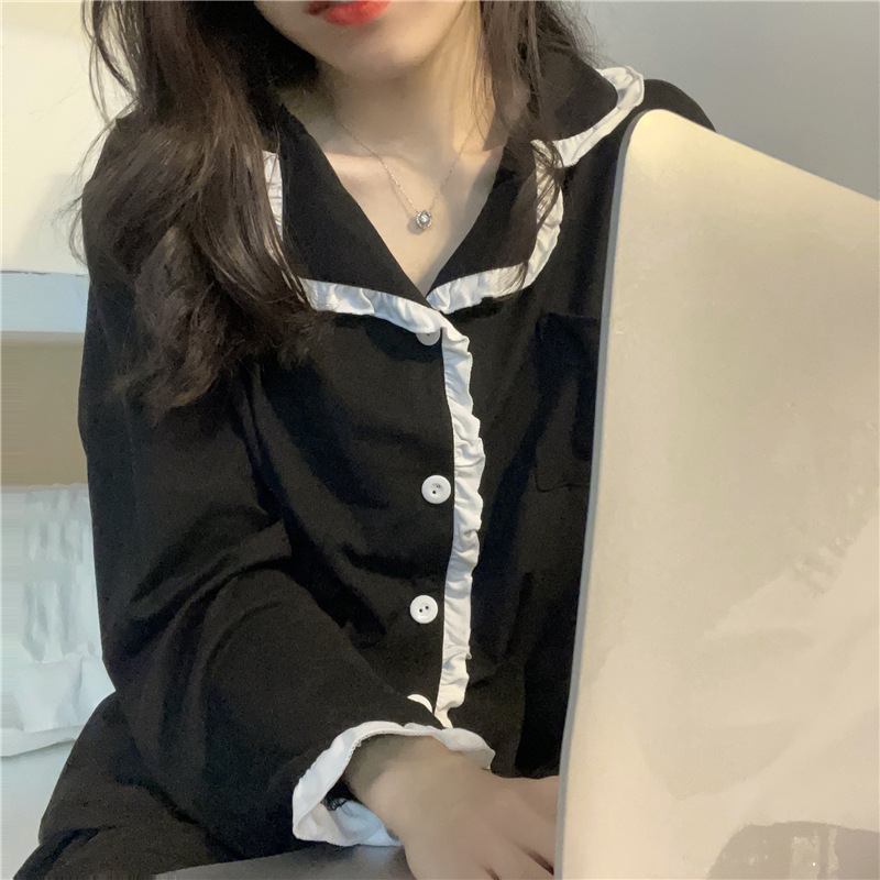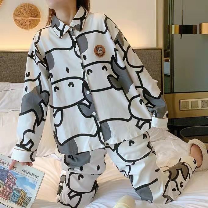 파자마 여성용 심플 스위트 사이버 연예인 긴팔 가디건 소녀의 한국식 얇은 가정복 투피스 세트스토어 가기