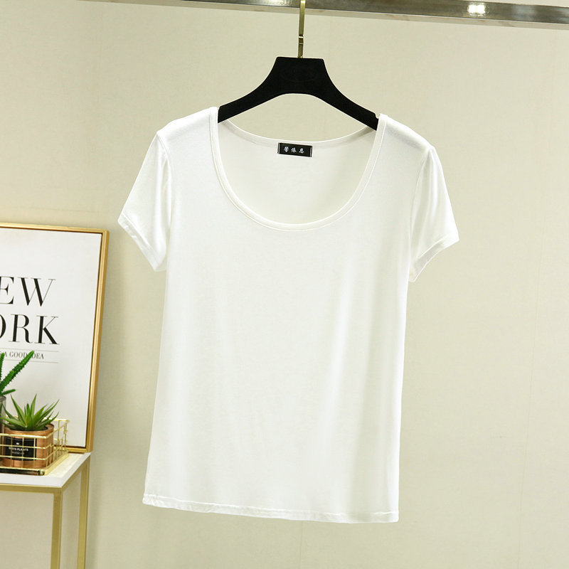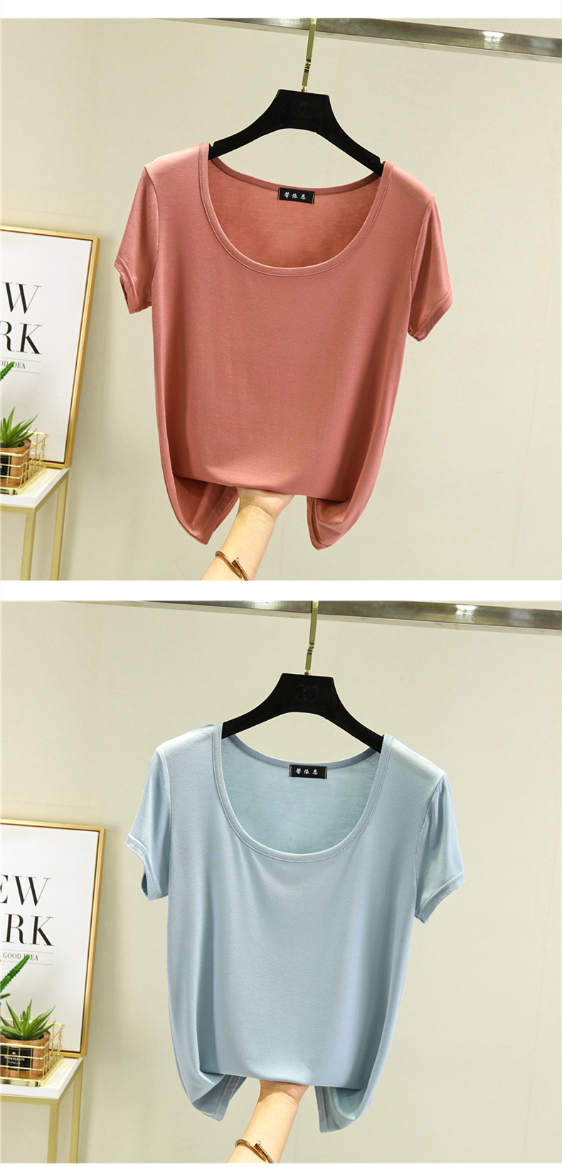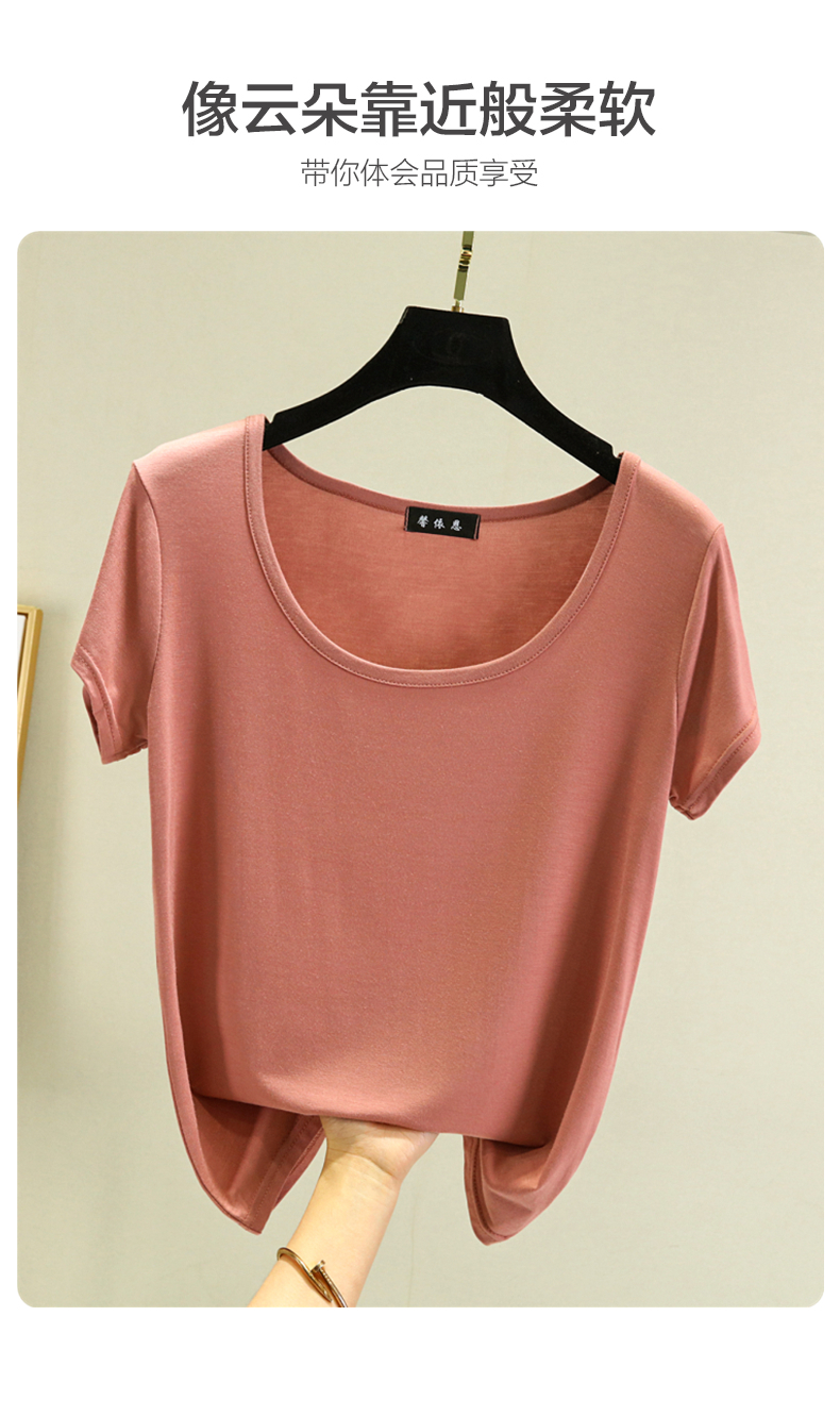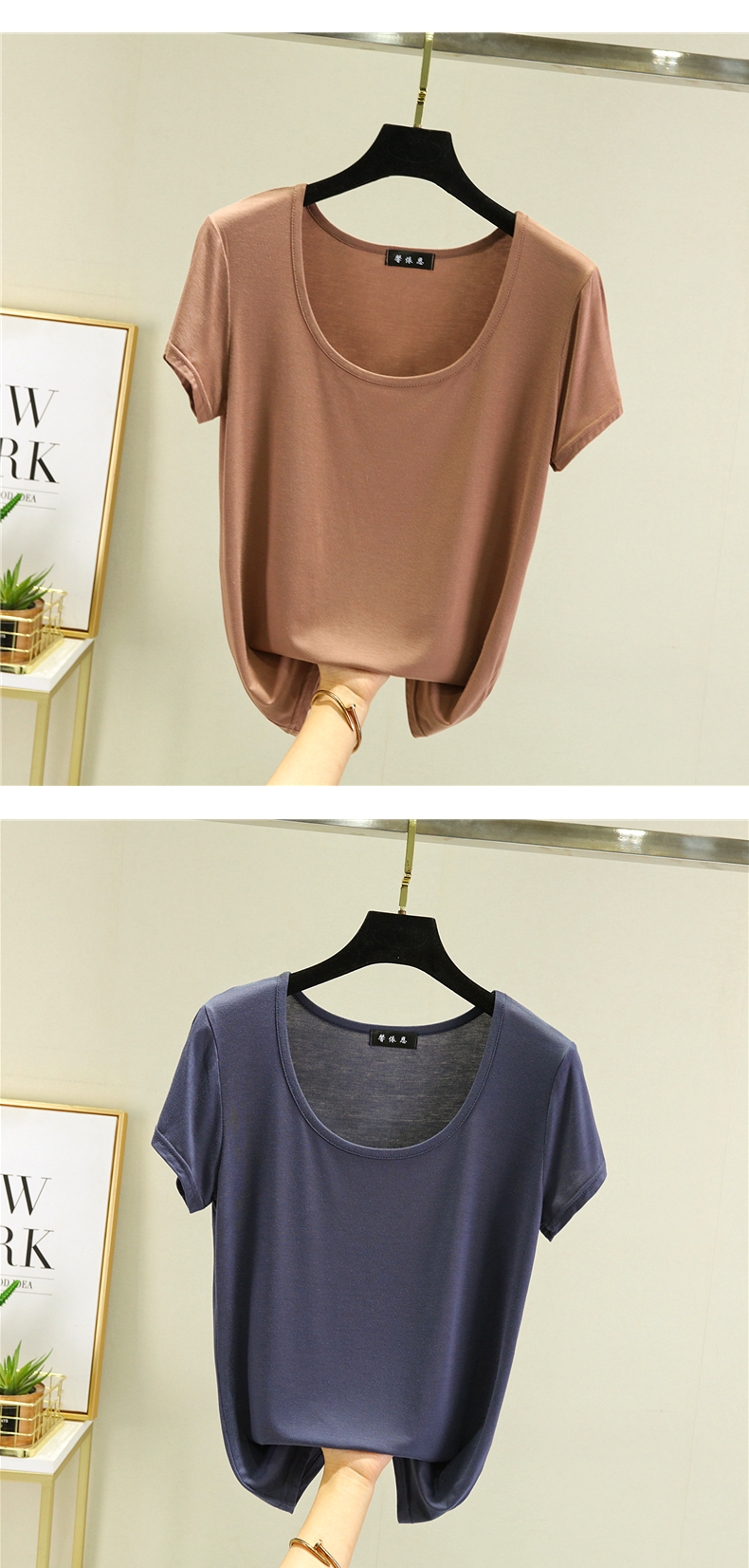여름 단색 모달 U-넥 반팔 티셔츠 여성용 플러스 사이즈 이너베이스 셔츠 얇은 겉옷 한국 스타일 루즈한 탑스토어 가기