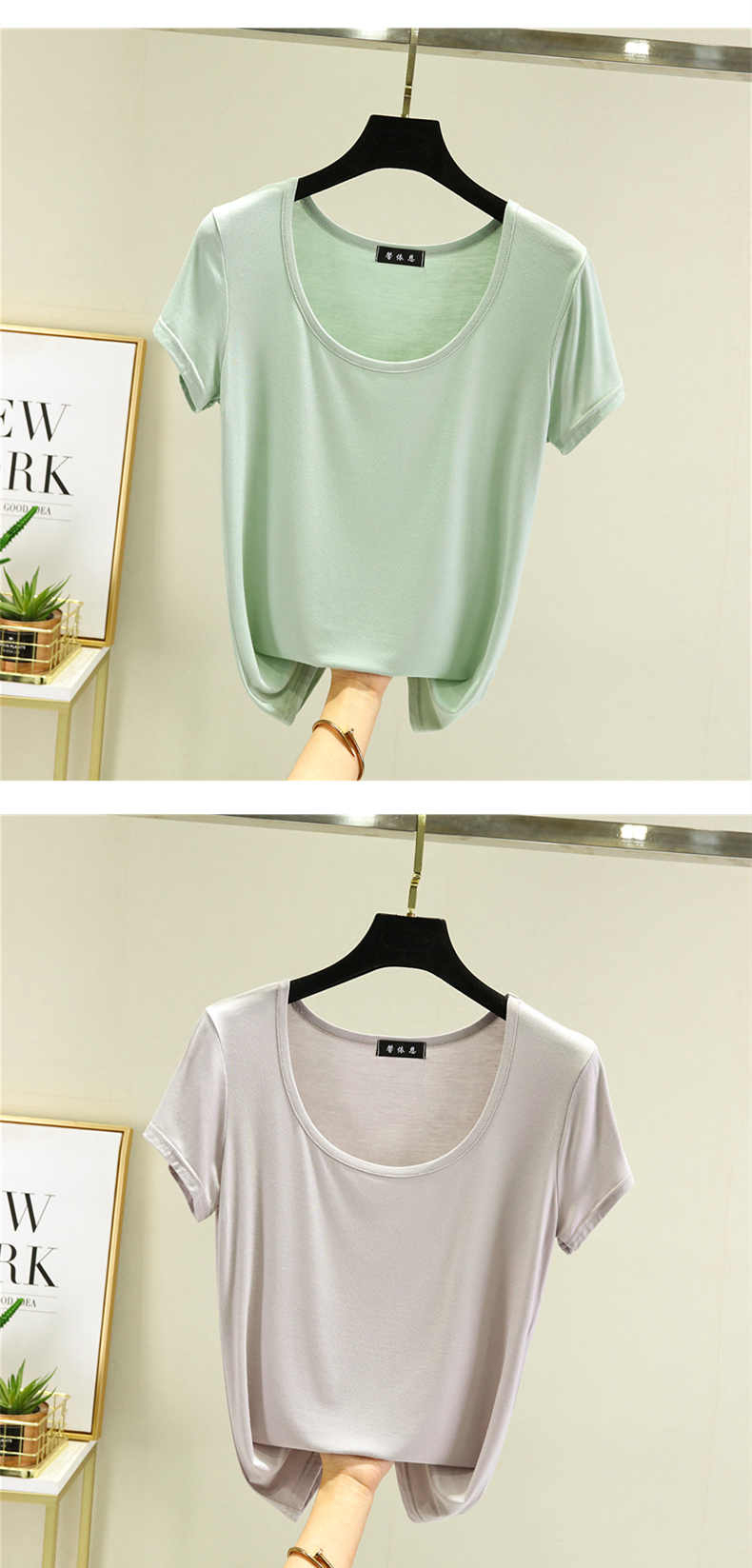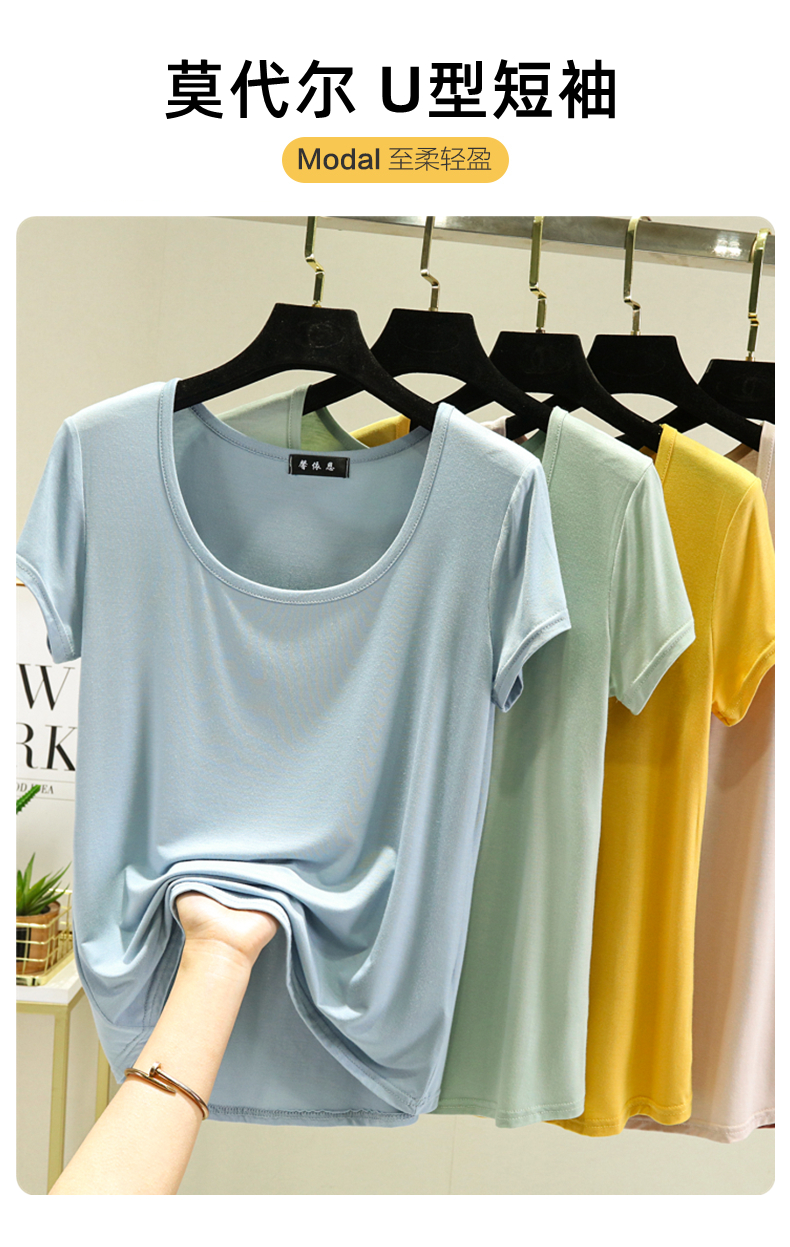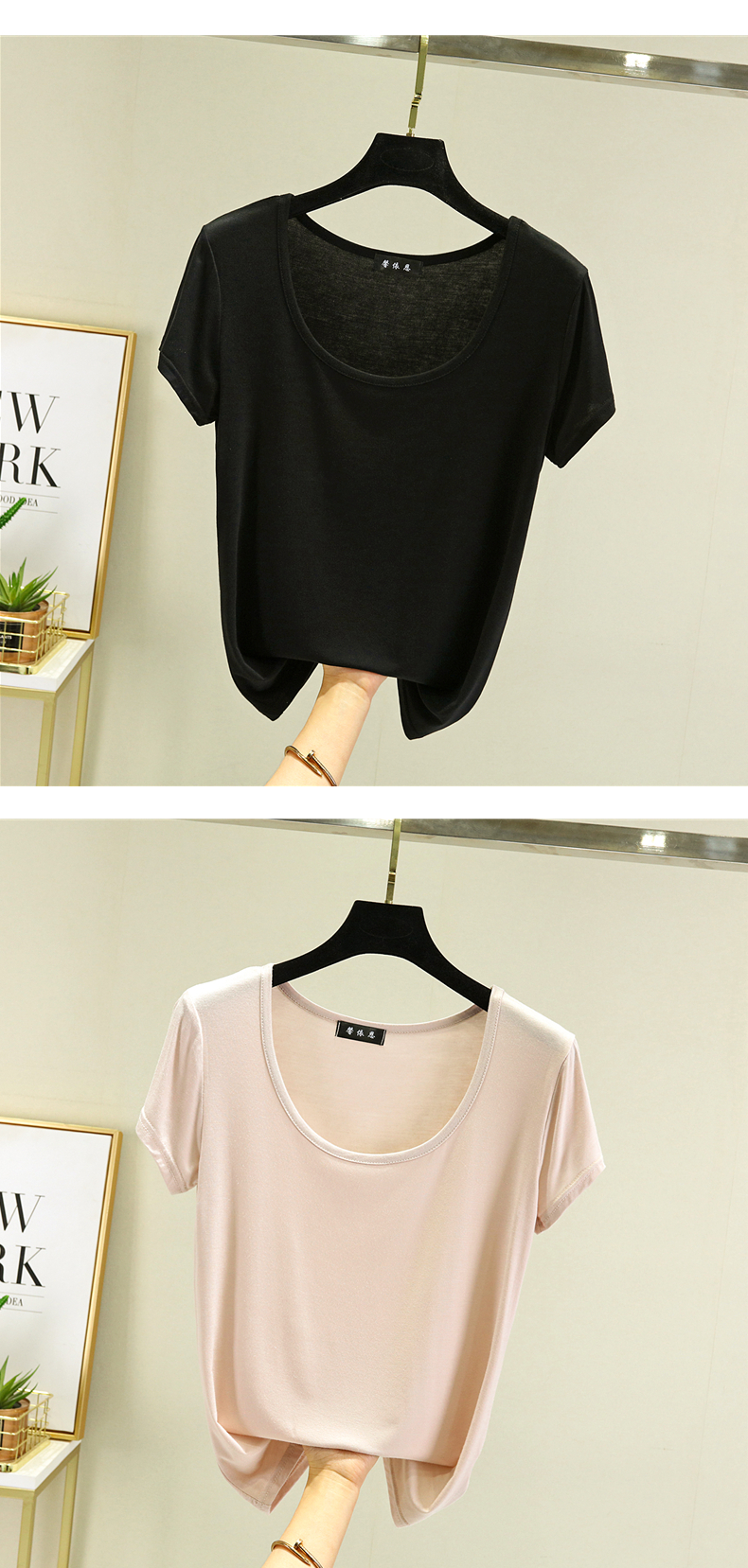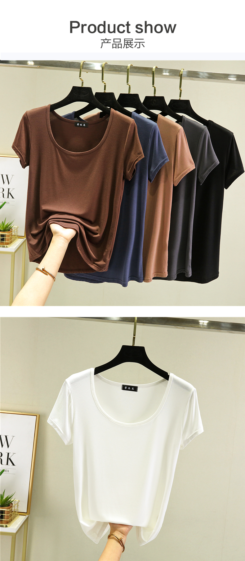 여름 단색 모달 U-넥 반팔 티셔츠 여성용 플러스 사이즈 이너베이스 셔츠 얇은 겉옷 한국 스타일 루즈한 탑스토어 가기