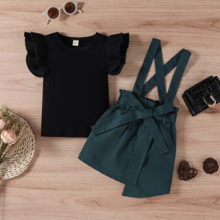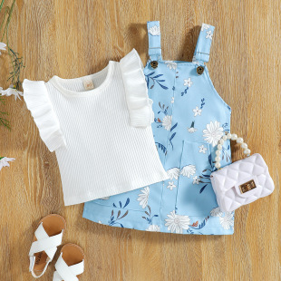 Baopai 아동복 외국 무역 소녀의 유아 인쇄 비행 소매 토끼 옷 원피스 옷 스트랩 조끼 스커트 여성 세트