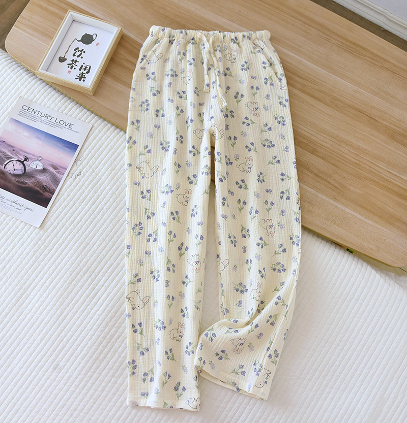 봄과 가을 여성의 더블 거즈 파자마 바지 일본식 플러스 사이즈 바지 여름 여성용 크레이프 모기 방지 홈 바지