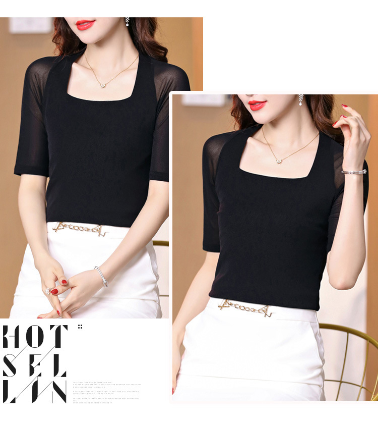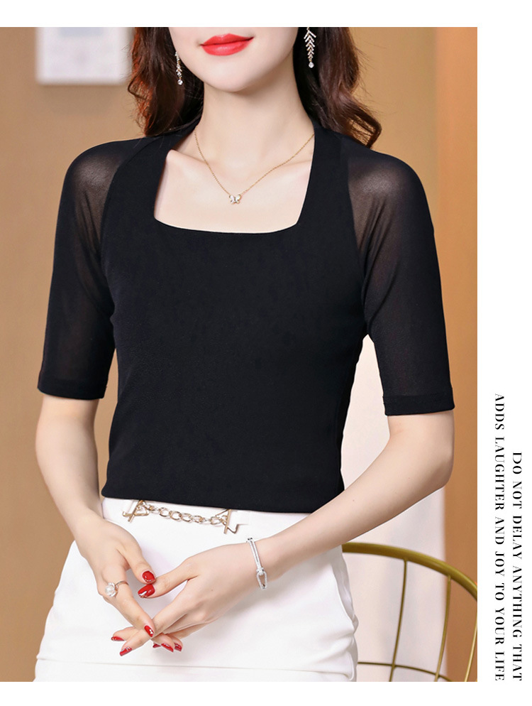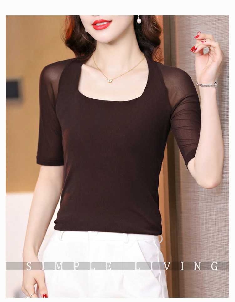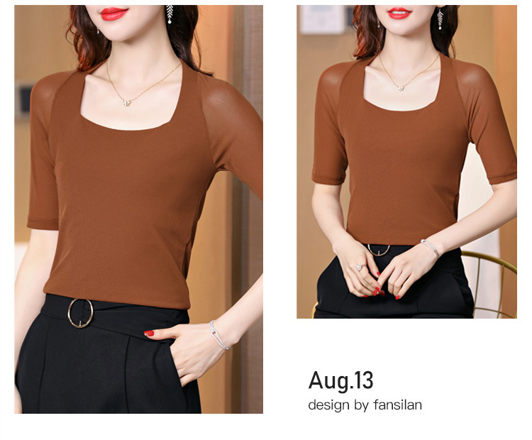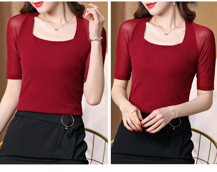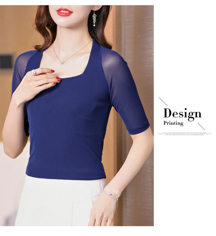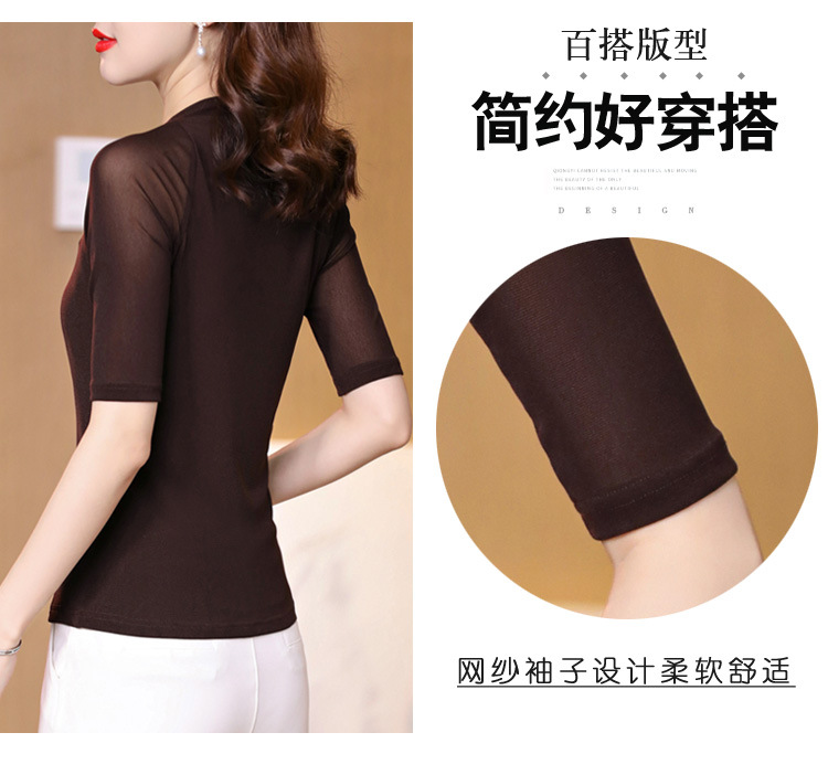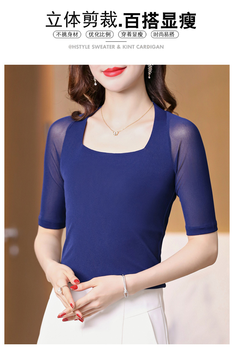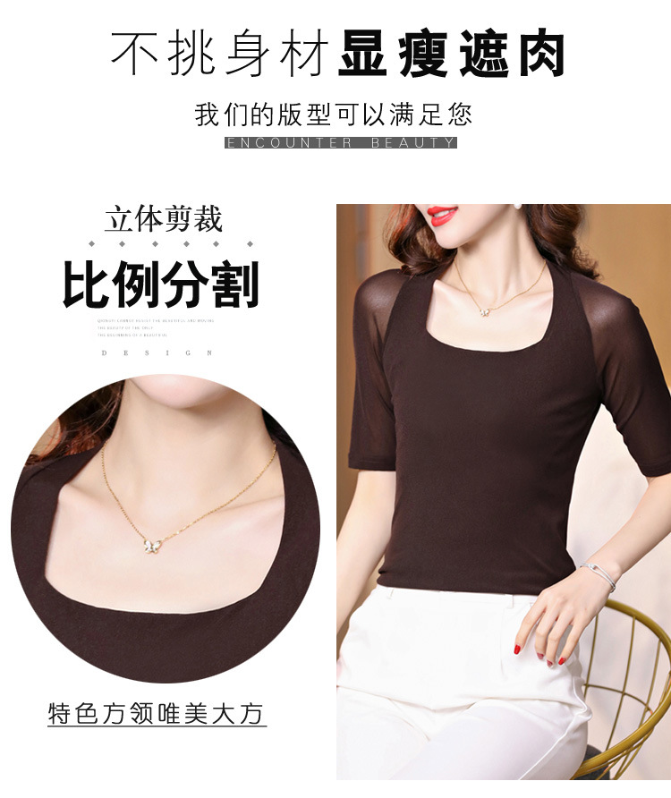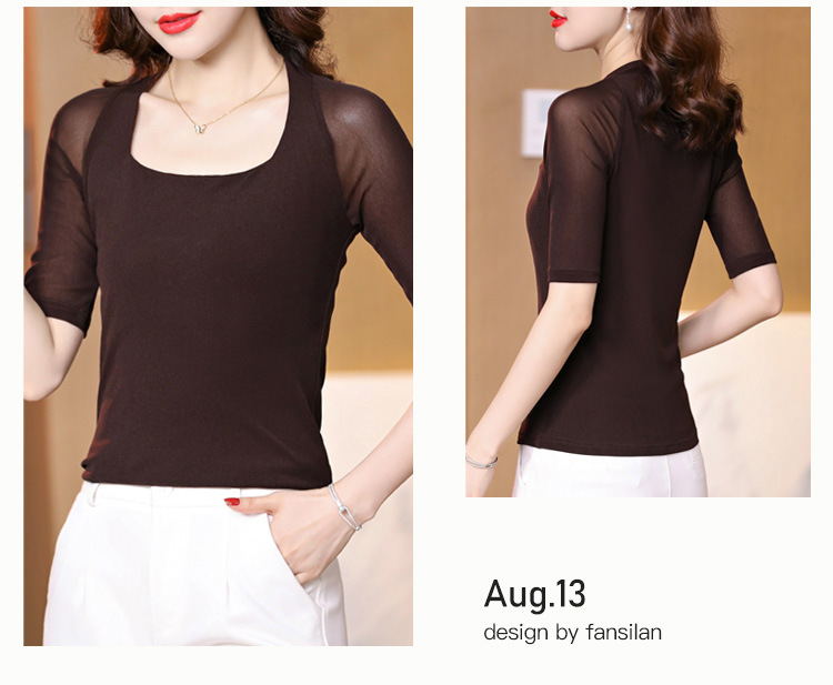 2022 봄과 여름 새로운 모든 매치 플러스 사이즈 티셔츠 단색 슬림핏 슬리밍 중간 소매 메쉬 베이스 셔츠 여성 댄스 의류
