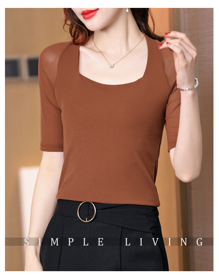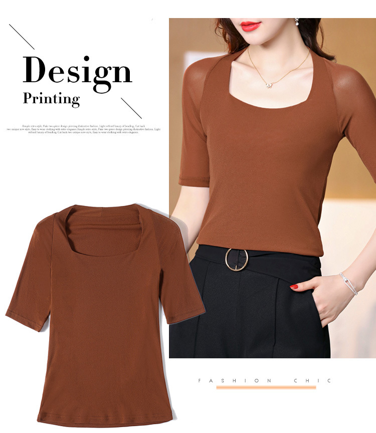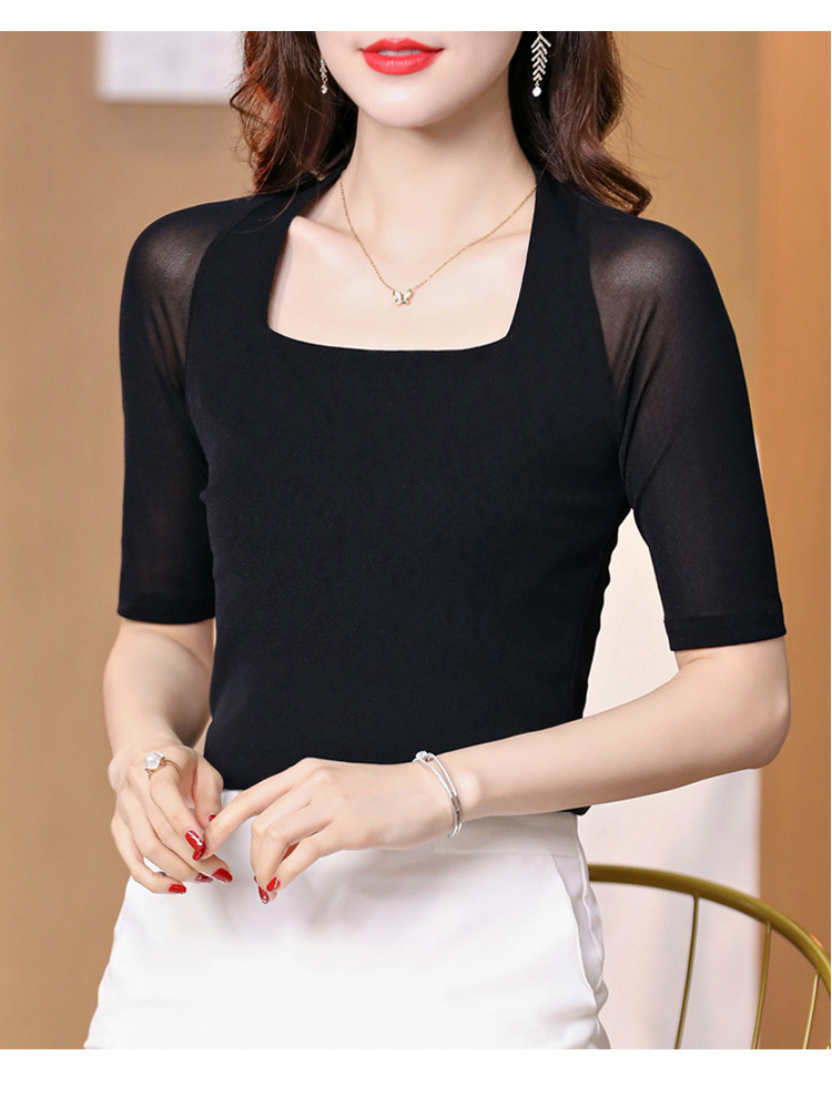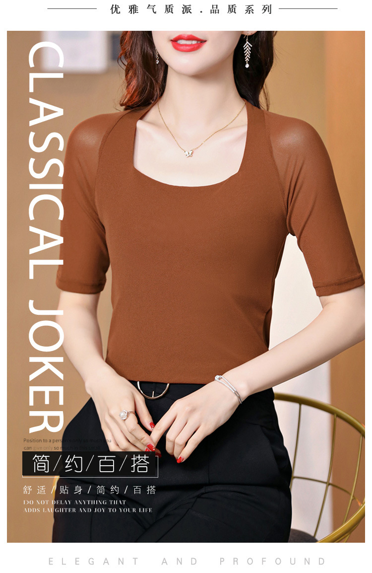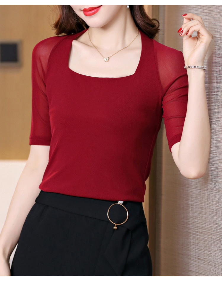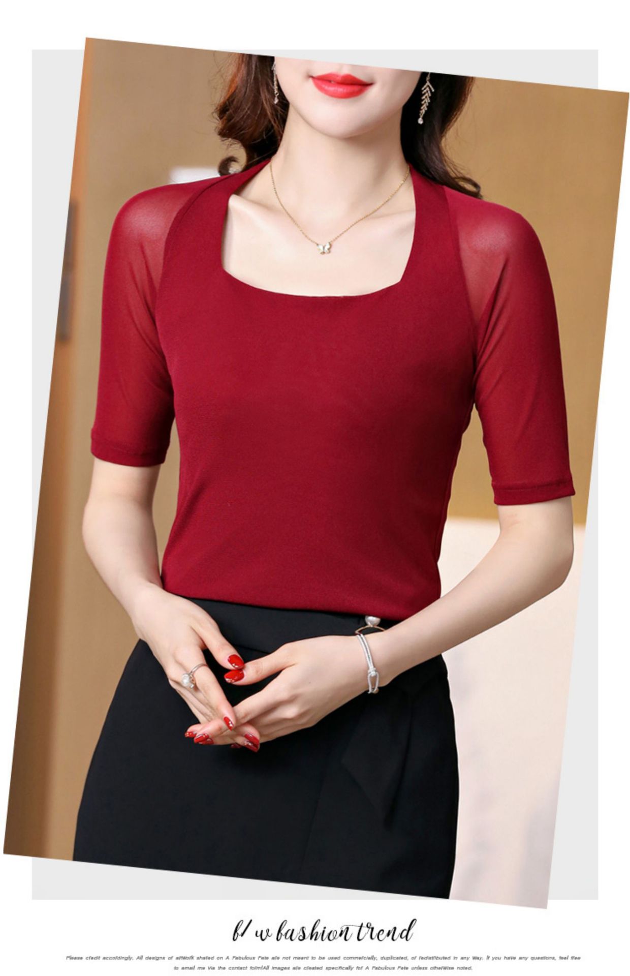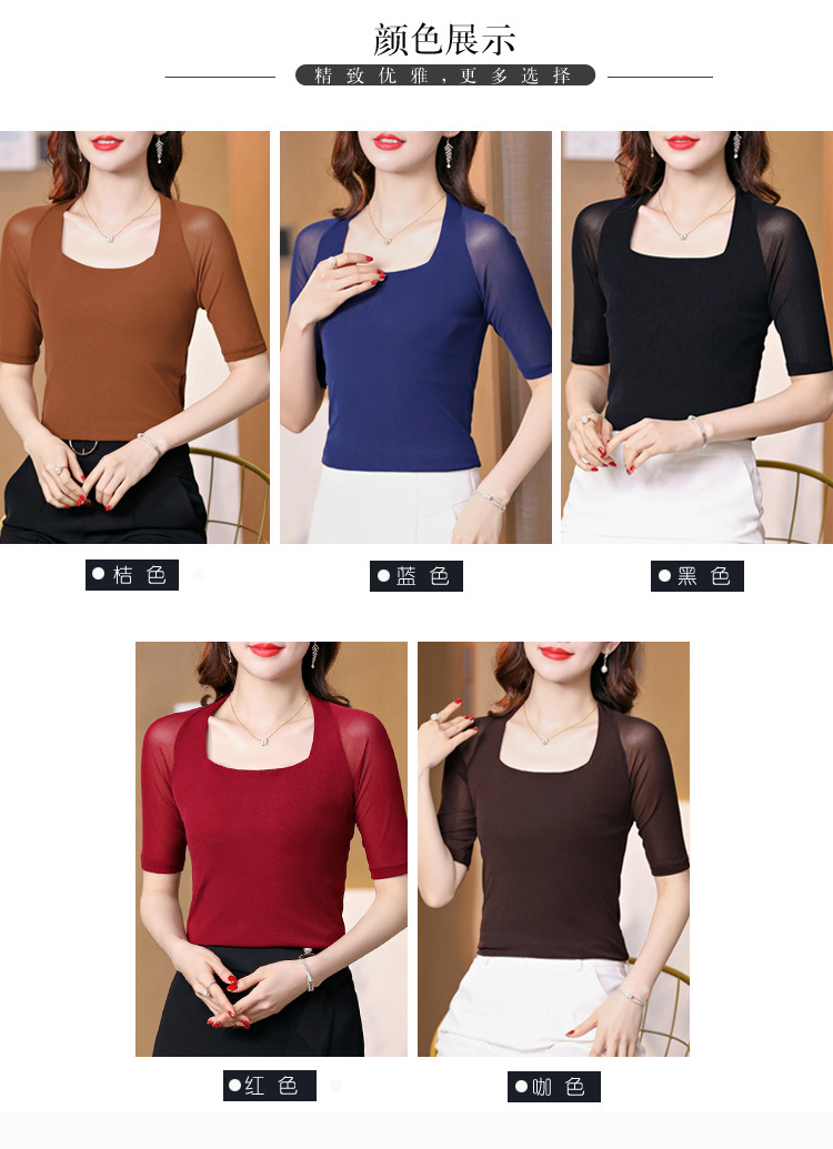 2022 봄과 여름 새로운 모든 매치 플러스 사이즈 티셔츠 단색 슬림핏 슬리밍 중간 소매 메쉬 베이스 셔츠 여성 댄스 의류