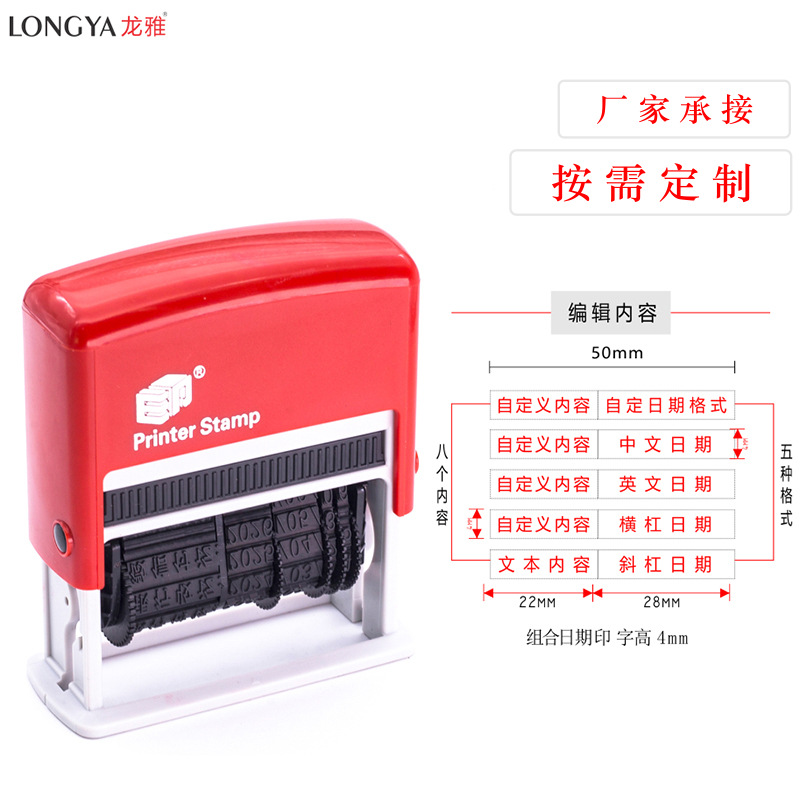 ED回墨印 三种规格20*字高3mm、28*字高4mm、50*字高4mm ,字高4.8mm在尺寸范围内,可按您需求,定制多种日期格式回墨印、自定义文本+数字回墨印、自定义文本+多种日期格式回墨印、及多种格式打码印等,印迹清晰,经久耐用。