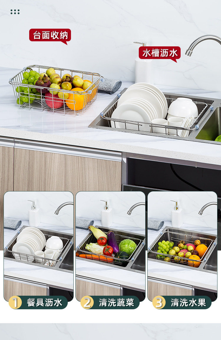 두꺼운 부엌 싱크대 확장 가능한 스테인레스 스틸 배수 바구니 싱크 배수 랙 야채 세면대 배수 바구니 그릇 랙 바구니