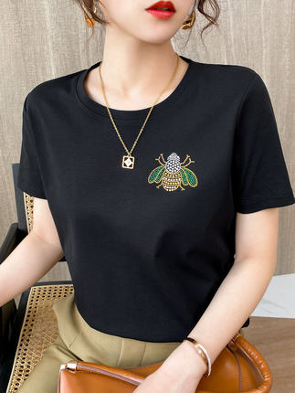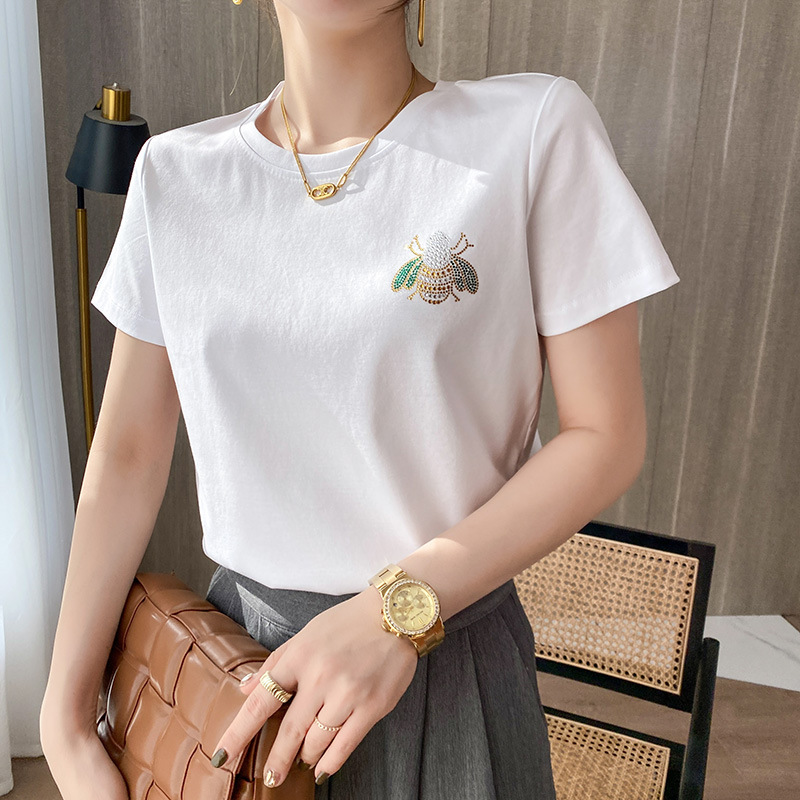 새로운 코튼 화이트 하프 슬리브 80 실크면 짧은 소매 티셔츠 여성의 뜨거운 드릴링 인쇄 디자인 틈새 탑 여름