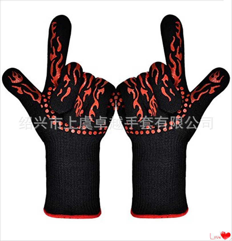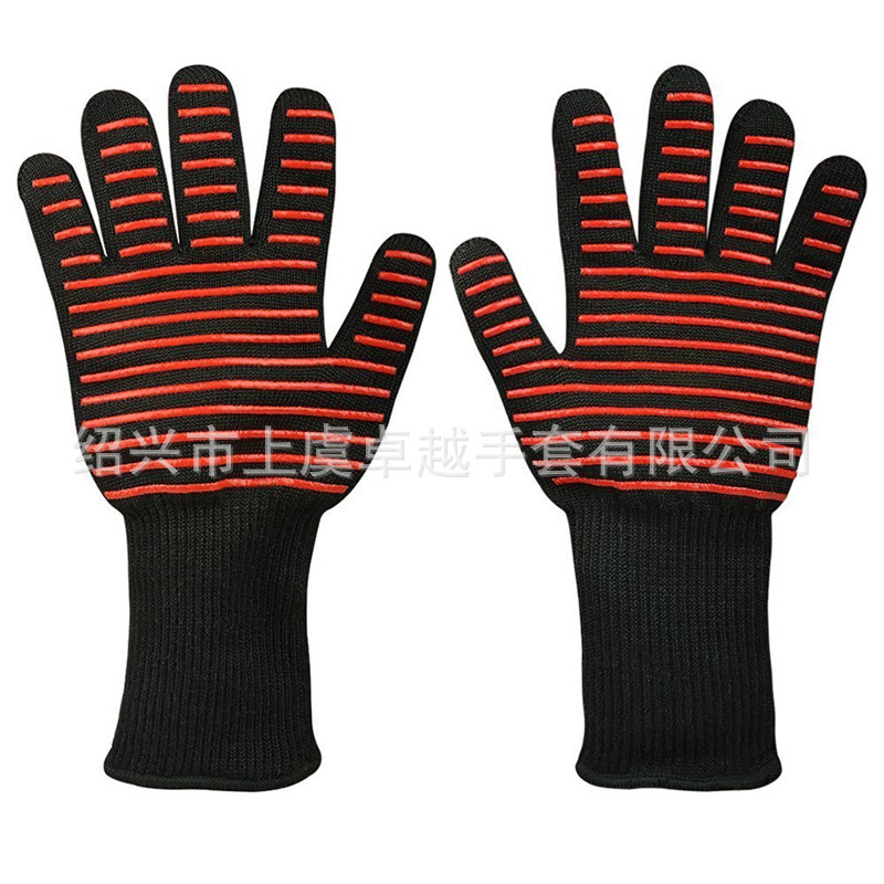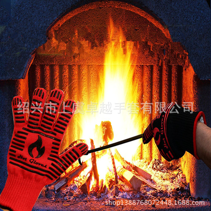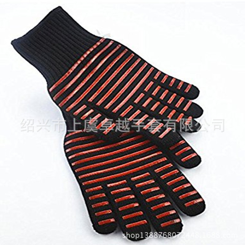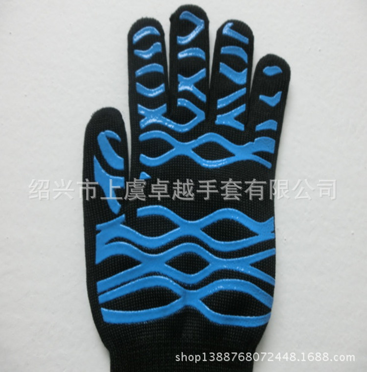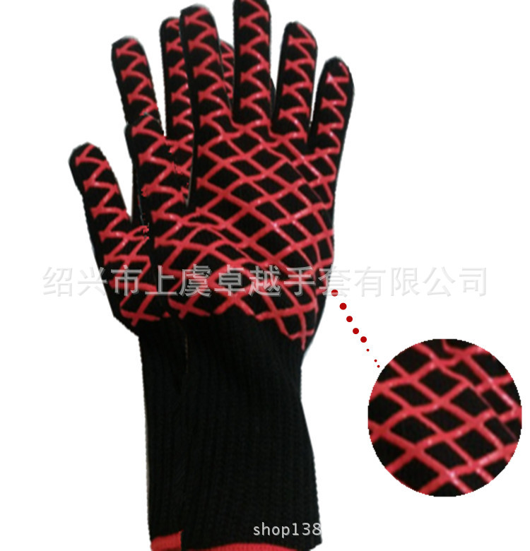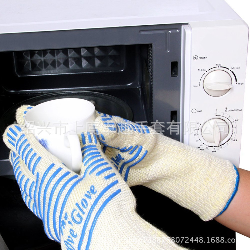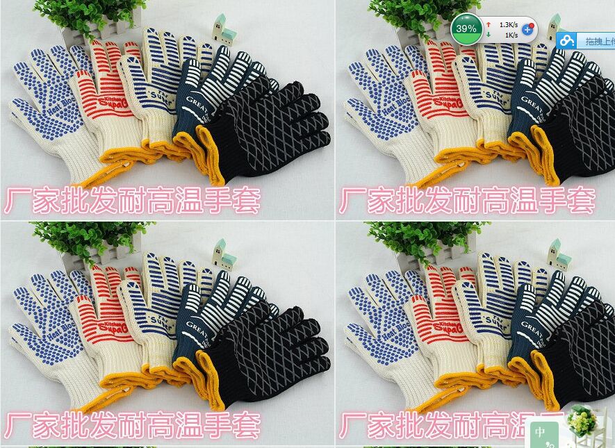 产品介绍:                                    品名;耐高温烤箱手套 材质外                        层棉纱,内层棉,                                                            最高耐热: 500摄氏度(瞬间温度)         用途:耐高温手套是在高温环境下使用的特种防高温手套,根据手部接触的温度可选择不同的耐高温手套,极高温混合化纤五指手套,手掌和食指耐磨硅胶层设计;适用烧烤,烤箱,微波炉,电磁炉!可定防割工业也可以使用产品可根据客户要求定做。                 产品特点:这种手套采用芳纶1313内层棉纤维结构,故同是提供优良的抗热防阻燃性能。手套有不同的样式,长度可以按照客户指定的长度设计,满足不同的客户群体需要。此外,这种手套还可以清洗,以延长手套使用寿命,并且不会降低性能。