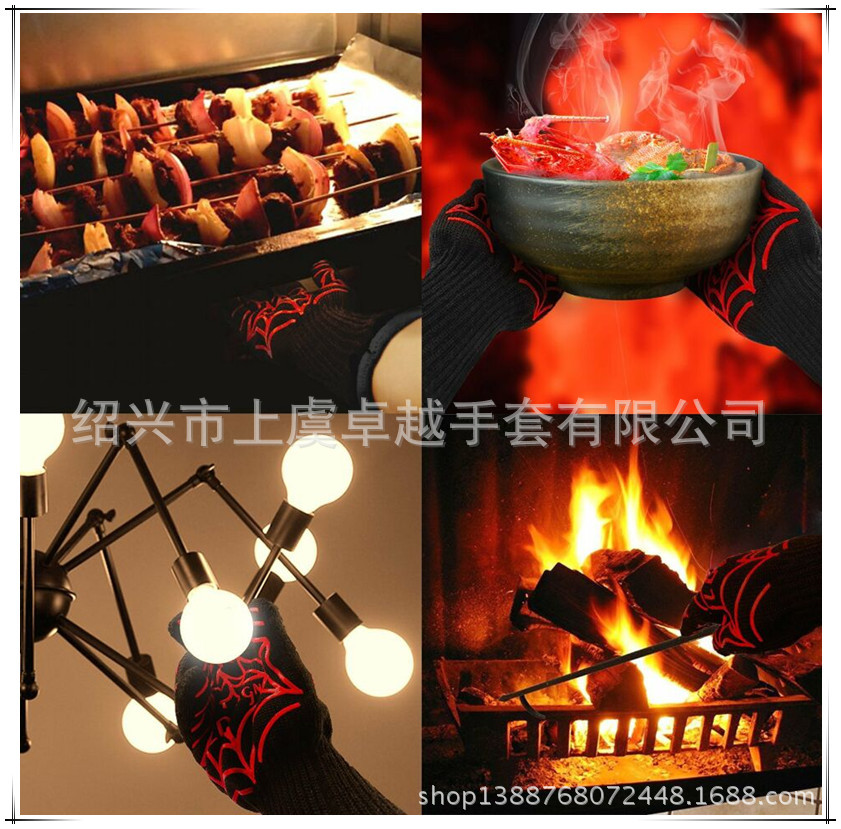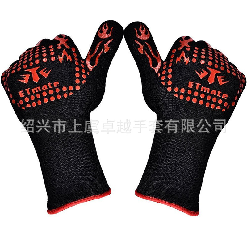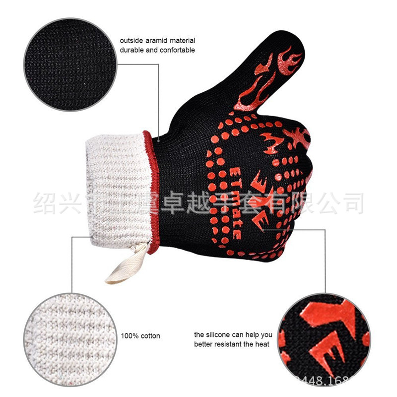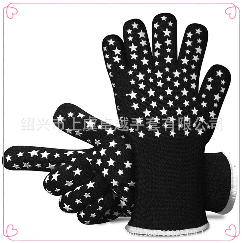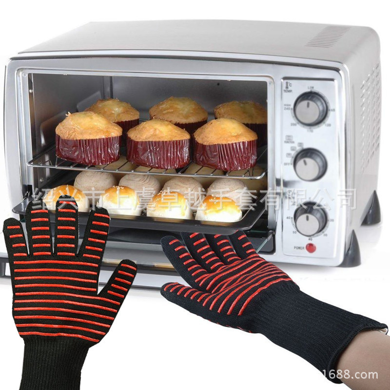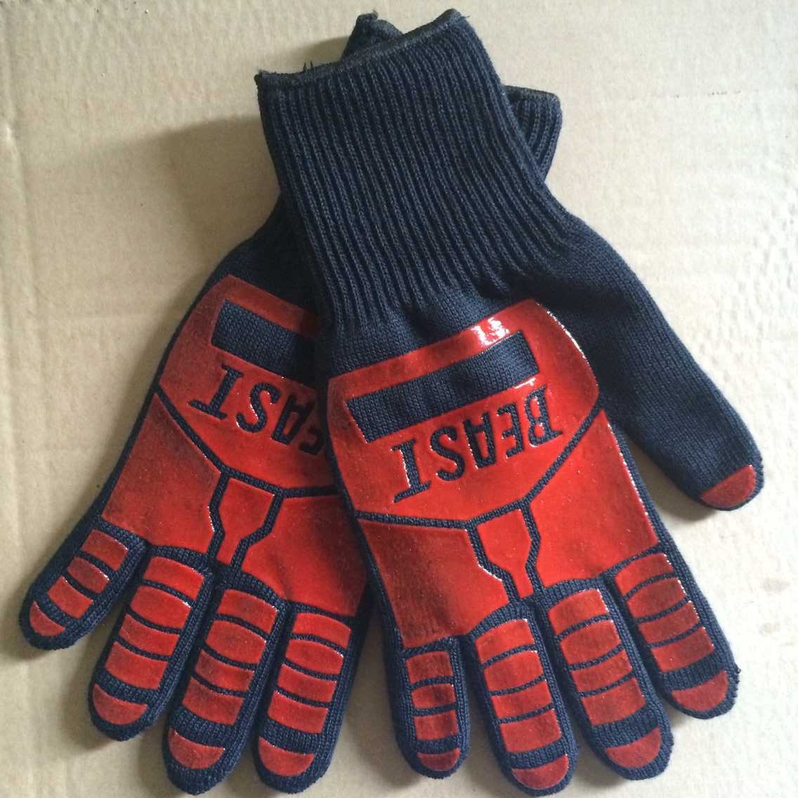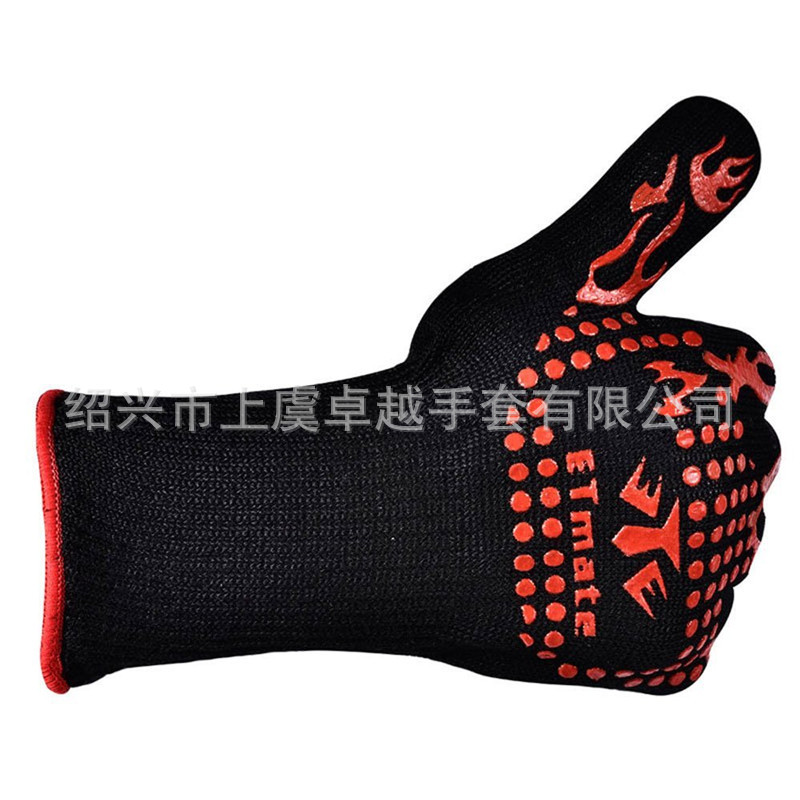 产品介绍:                                    品名;耐高温烤箱手套 材质外                        层棉纱,内层棉,                                                            最高耐热: 500摄氏度(瞬间温度)         用途:耐高温手套是在高温环境下使用的特种防高温手套,根据手部接触的温度可选择不同的耐高温手套,极高温混合化纤五指手套,手掌和食指耐磨硅胶层设计;适用烧烤,烤箱,微波炉,电磁炉!可定防割工业也可以使用产品可根据客户要求定做。                 产品特点:这种手套采用芳纶1313内层棉纤维结构,故同是提供优良的抗热防阻燃性能。手套有不同的样式,长度可以按照客户指定的长度设计,满足不同的客户群体需要。此外,这种手套还可以清洗,以延长手套使用寿命,并且不会降低性能。