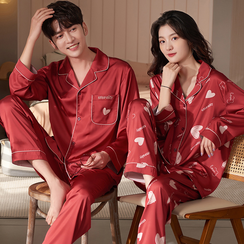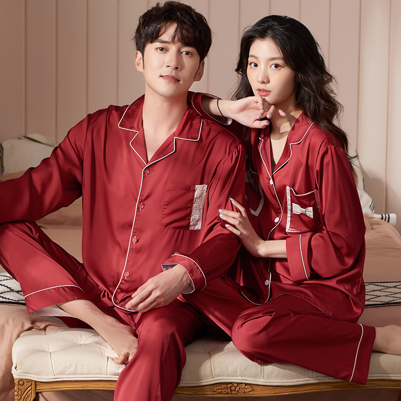 커플 잠옷 봄과 가을 여성용 긴팔 아이스 실크 얇은 고급 남성용 반팔 실크 여름 겉옷 가정복스토어 가기
