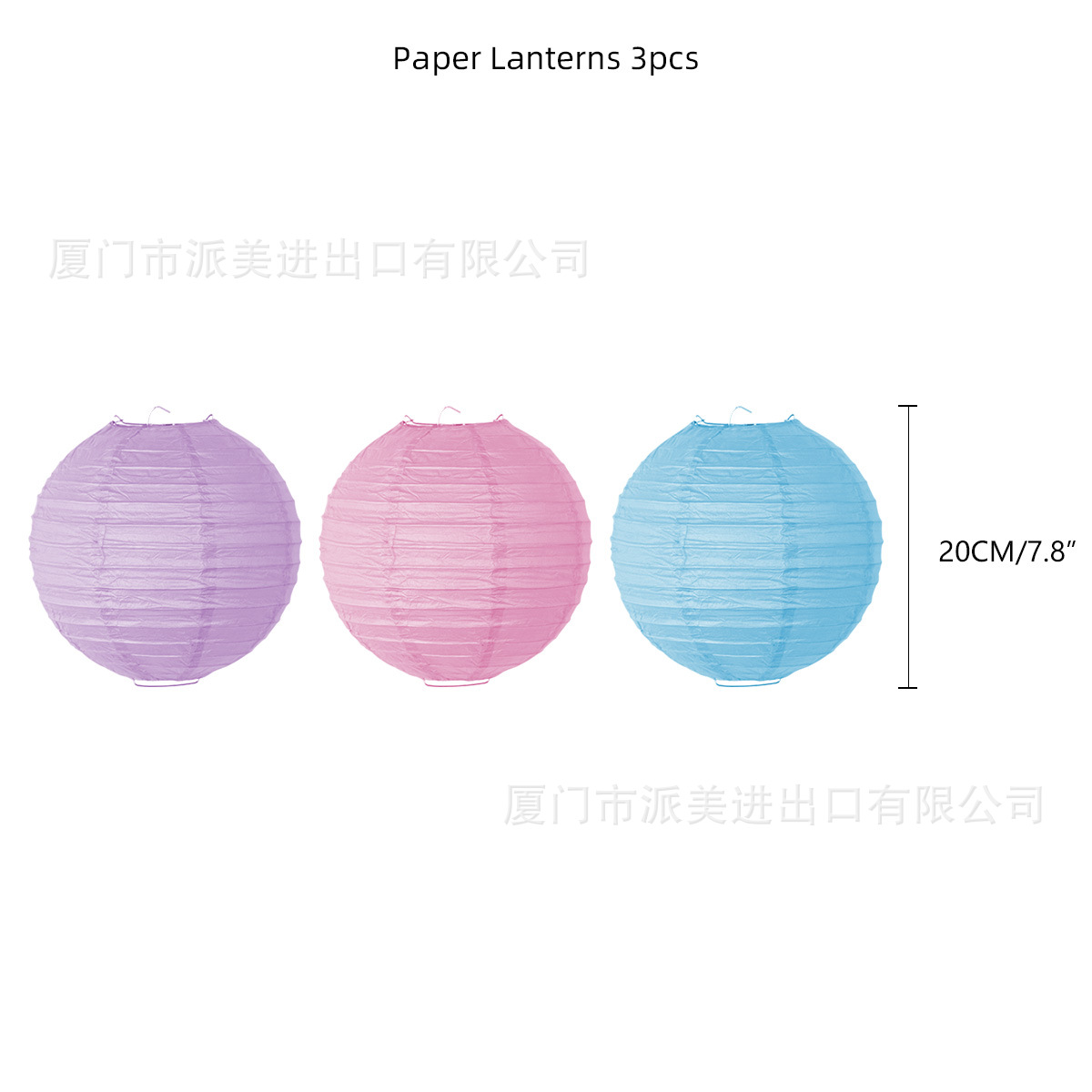 套装3:3个20cm灯笼(浅紫+粉色+浅蓝)+12个美人鱼卡片+1条字母拉旗+6条双开尾螺旋(3紫+3粉)+8个蛋糕围边+2个鱼尾铝膜+16个乳胶气球