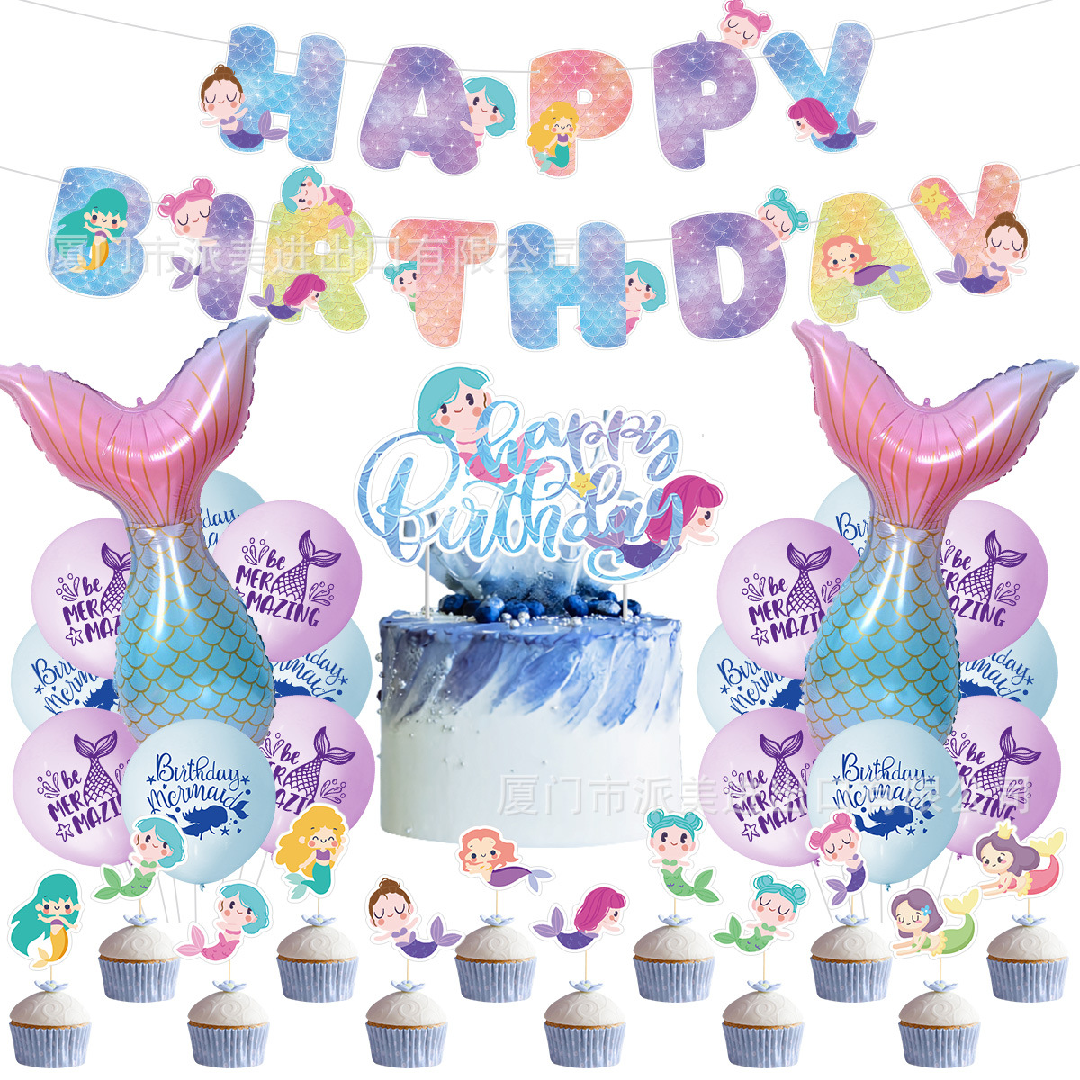 套装1:1条字母拉旗+1个蛋糕插排+12个蛋糕插旗+16个乳胶气球+2个鱼尾铝膜