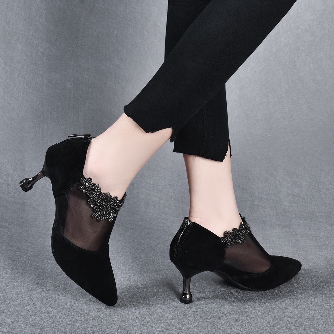 여성 신발 2022 이른 봄 새로운 패션 뾰족한 스틸레토 하이힐 메쉬 신발 양모 모조 다이아몬드 백 지퍼 기질 힐 신발스토어 가기