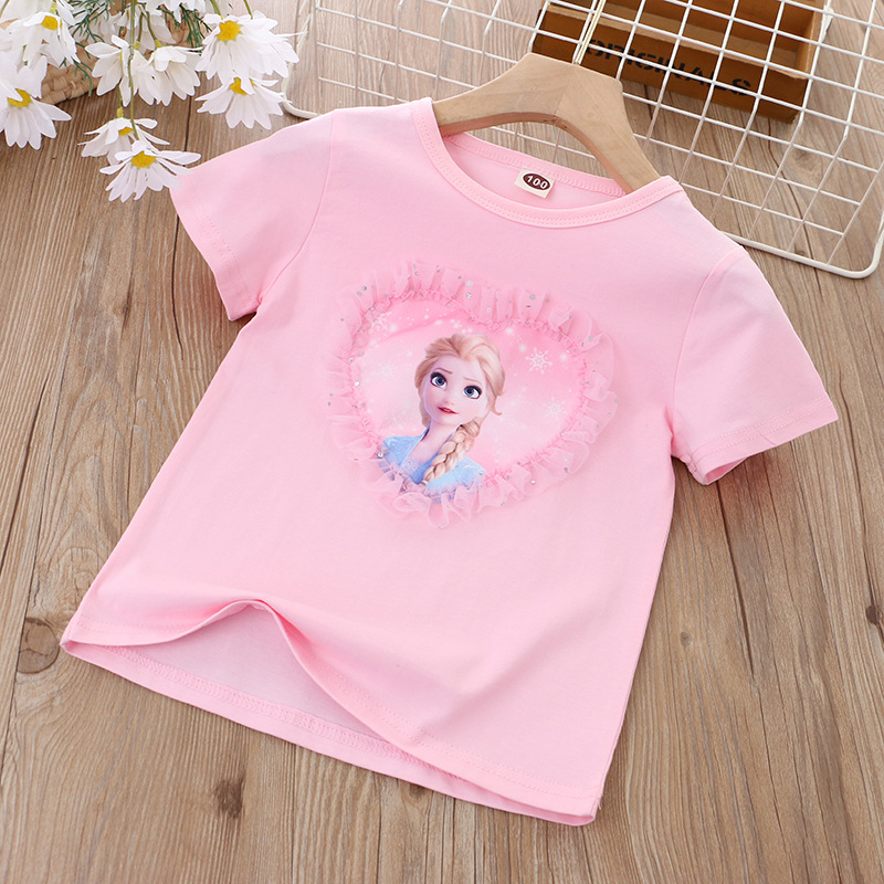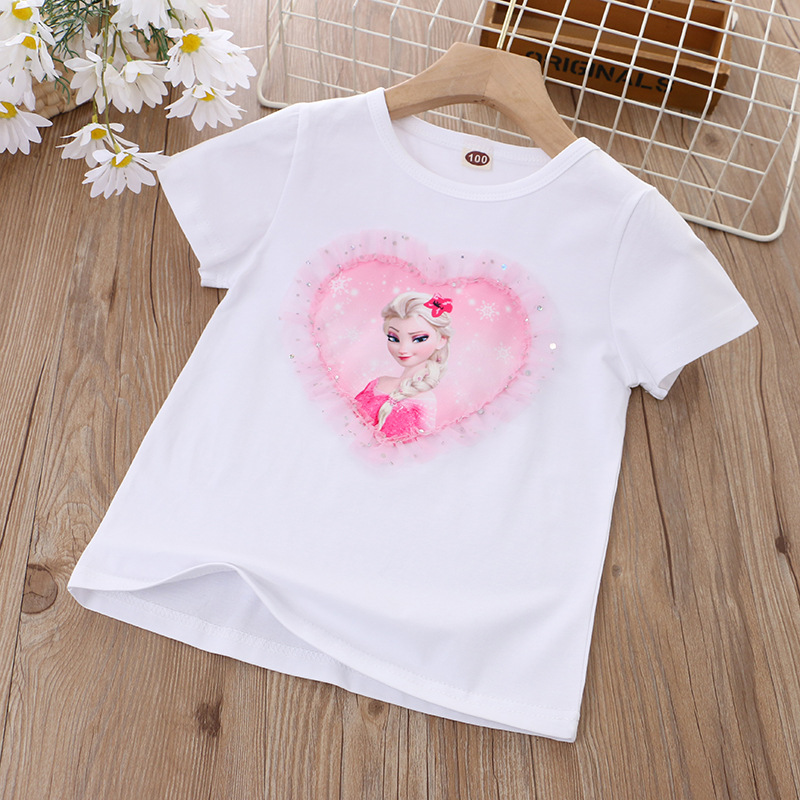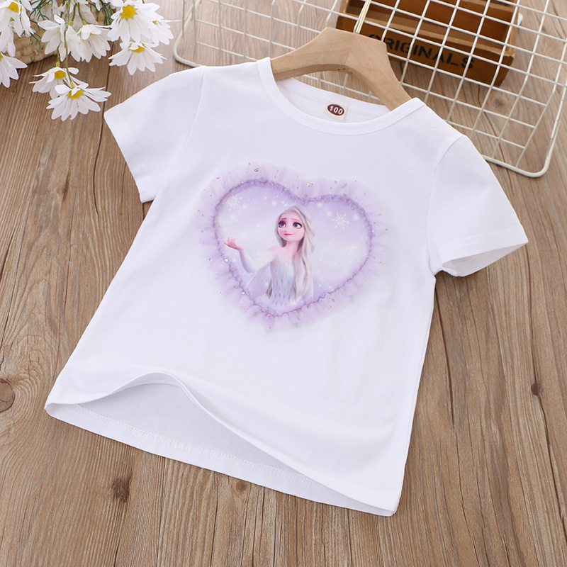 2025 아동 의류 여름 새 스타일 소녀 반팔 바닥 셔츠 만화 공주 사랑 반팔 탑 티셔츠 코튼 대외 무역스토어 가기