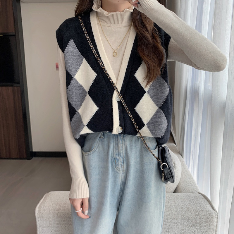 가을 신상 루즈핏 여성 브이넥 민소매 가디건 레트로 다이아몬드 니트 조끼 여성용스토어 가기