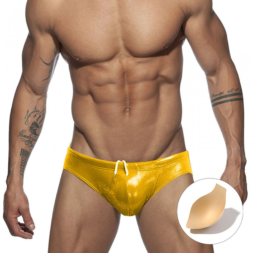 UXH 남성용 모조 가죽 스팽글 컵 삼각형 수영 트렁크 U 볼록한 입체 성능 활주로 브리프 비치 트라이앵글 남성