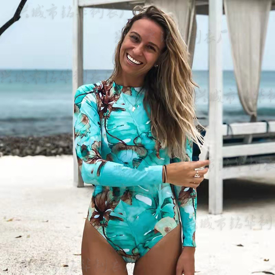 2025 유럽 및 미국 스타일 슬림핏 프린트 섹시 원피스 수영복 여성용 수출용 스포츠 긴팔 지퍼 서핑 수영복스토어 가기