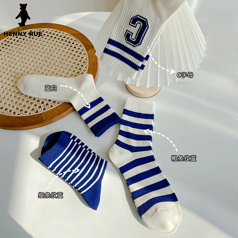봄과 여름 면 품질 센스 블루 스트라이프 중간 튜브 남녀 공용 양말 2306 남성과 여성을위한스토어 가기
