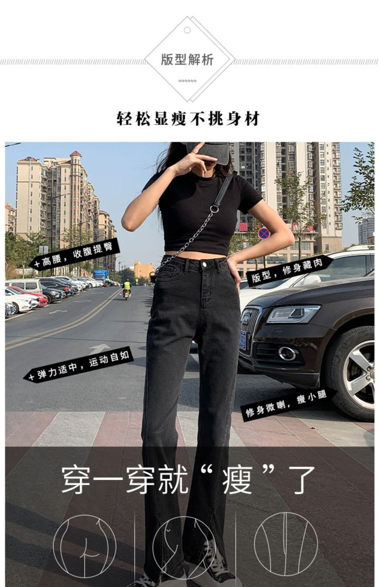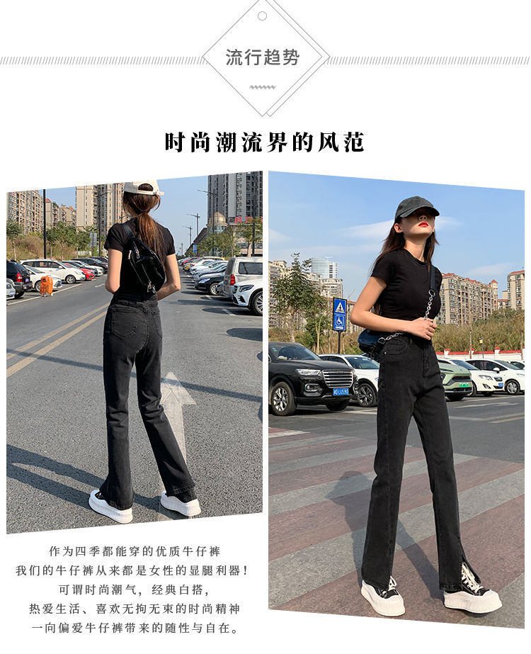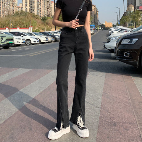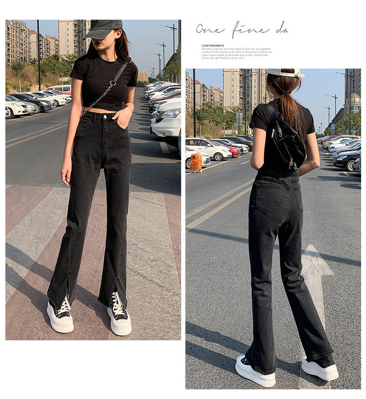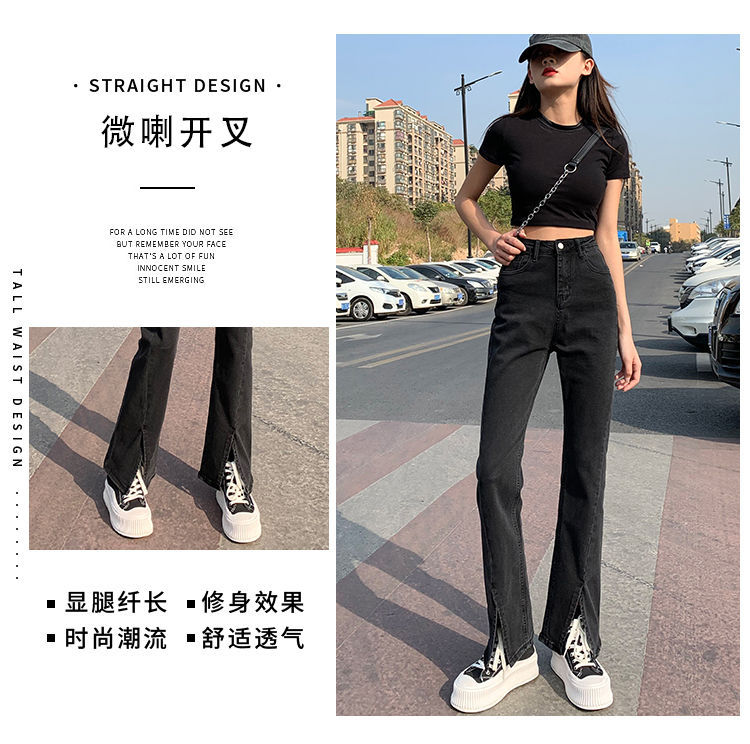 블랙 하이 웨이스트 프론트 스플릿 청바지 여성용 2023 새로운 스트레치 와이드 레그 드레이핑 스플릿 플로어 마이크로 혼 바지스토어 가기