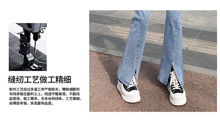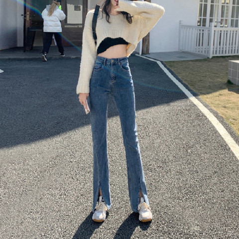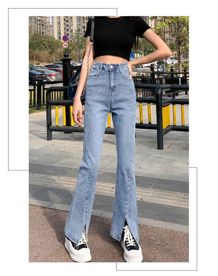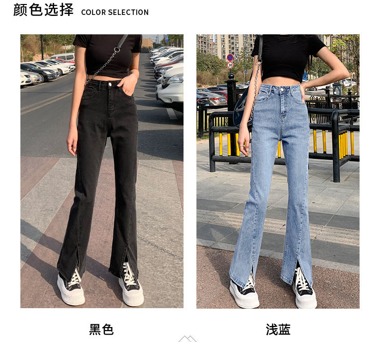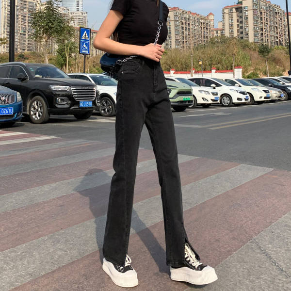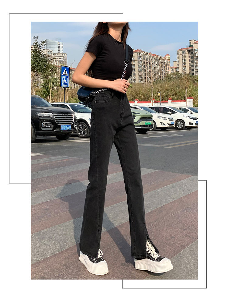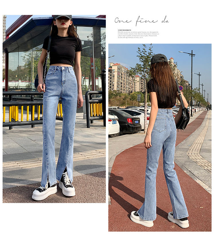 블랙 하이 웨이스트 프론트 스플릿 청바지 여성용 2023 새로운 스트레치 와이드 레그 드레이핑 스플릿 플로어 마이크로 혼 바지스토어 가기