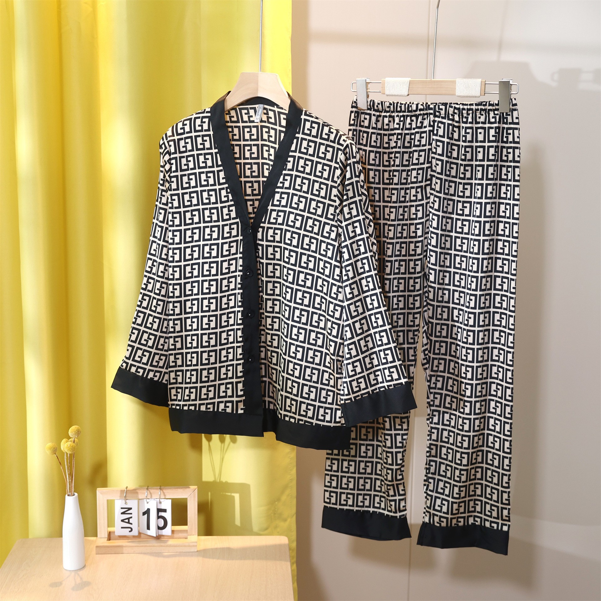 라이브 제품 새로운 잠옷 여성용 아이스 실크 세트 가정 옷 봄과 가을 스타일 세트 V 넥 머리에 사용할 수 있습니다