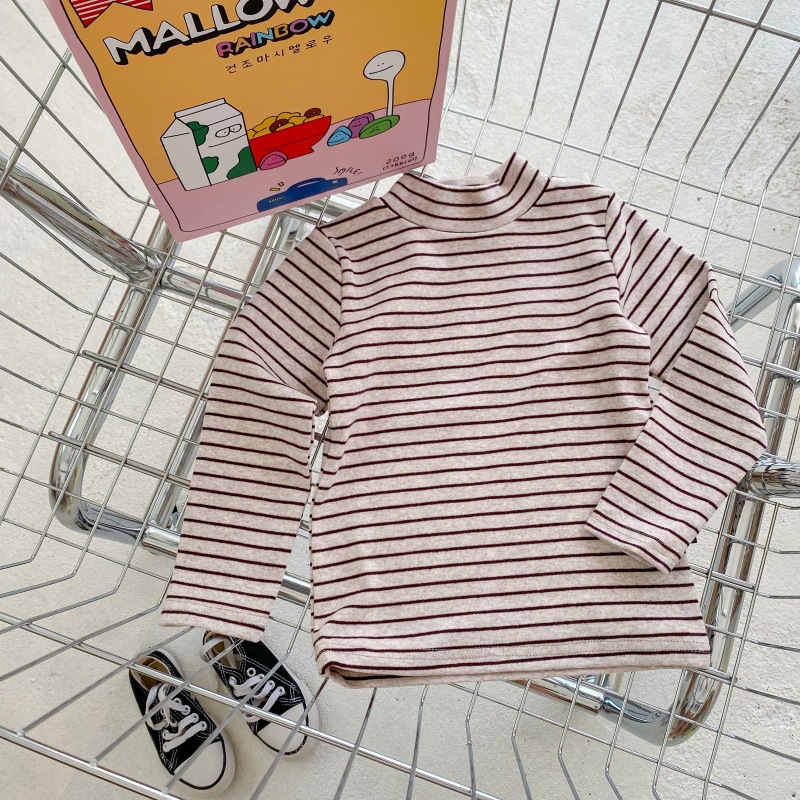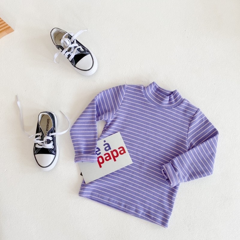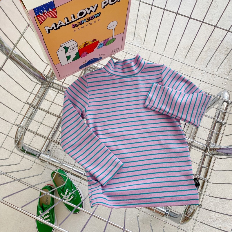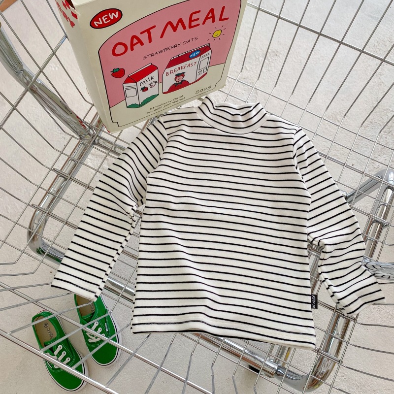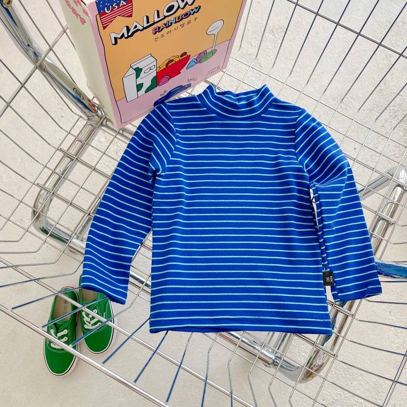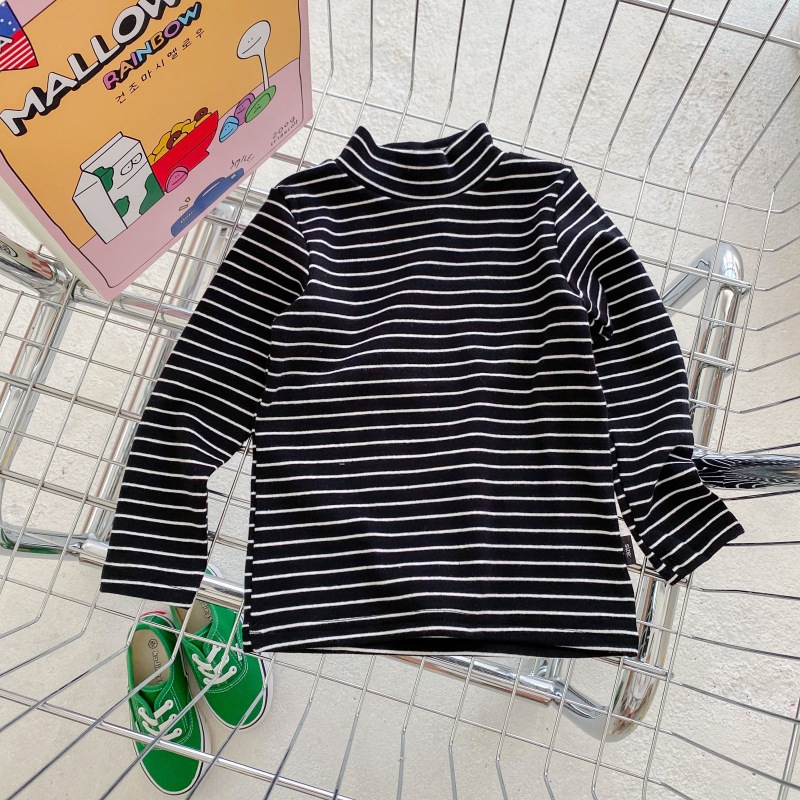 어린이 하프 하이 칼라 스트라이프 베이스 셔츠 소년 소녀 중간 칼라 긴팔 티셔츠 2023 새로운 소년 아기 하이 칼라 탑스토어 가기