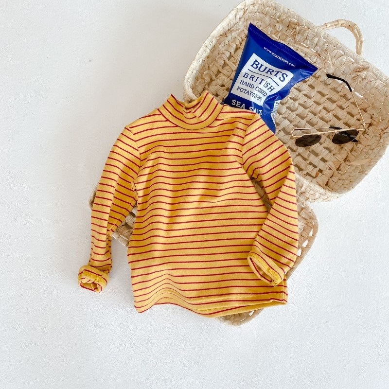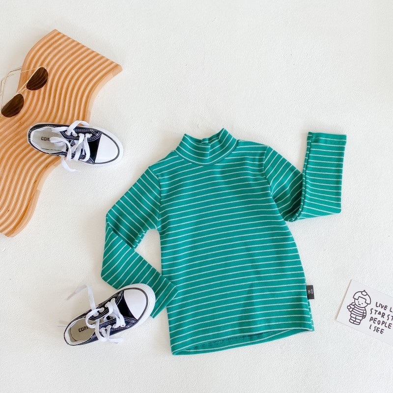 어린이 하프 하이 칼라 스트라이프 베이스 셔츠 소년 소녀 중간 칼라 긴팔 티셔츠 2023 새로운 소년 아기 하이 칼라 탑