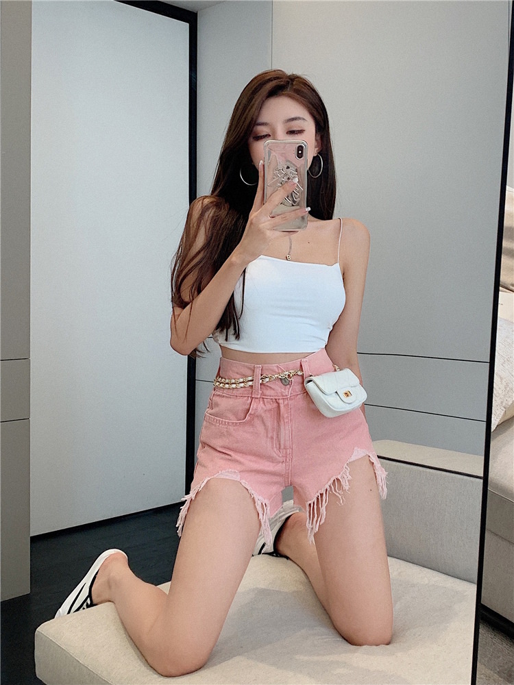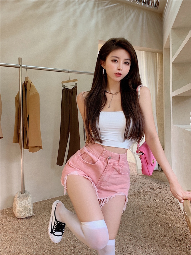핑크 복고풍 구멍 솔질 하이 웨이스트 데님 반바지 여자의 2023 봄 새로운 와이드 레그 a 자 모양의 핫 팬츠 트렌디스토어 가기