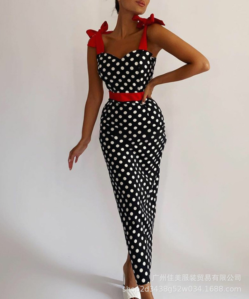 유럽과 미국의 여성 의류 2022 새로운 국경 전자 상거래 여름 한 캐릭터 어깨 허리 웨이브 도트 대비 스티칭 원피스 재고스토어 가기
