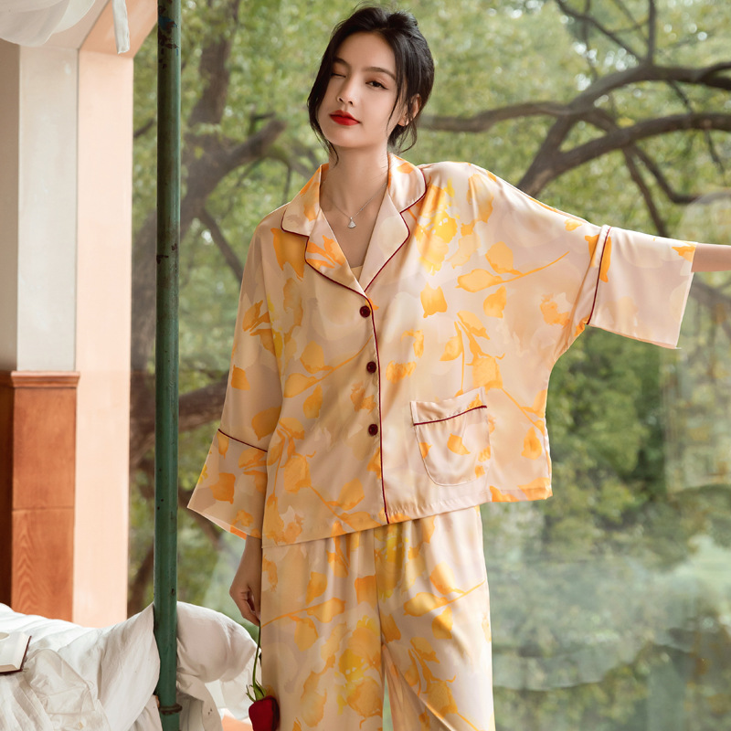 봄과 가을 한국 스타일 TikTok 인터넷 연예인 얼음 실크 얇은 잠옷 긴 소매 실크 세트 여자의 실크 가정 옷