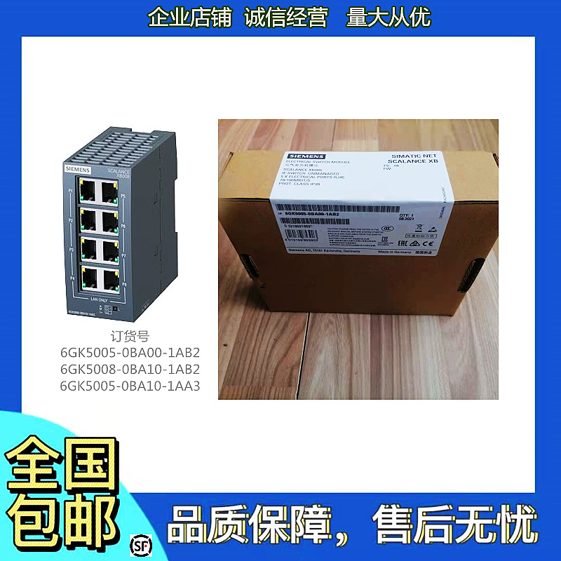 SCALANCE XB005 非网管型 工业以太网交换机针对 10/100 Mbit/s;用于架设 小型星状和 线状结构;LED 诊断, IP20.24V AC/DC 电源,带 5个 10/100 Mbit/s 双绞线 端口及 RJ45 插座,净重:0.254 Kg,包装尺寸:14.20 x 18.20 x 5.60 ,包装单位:1件