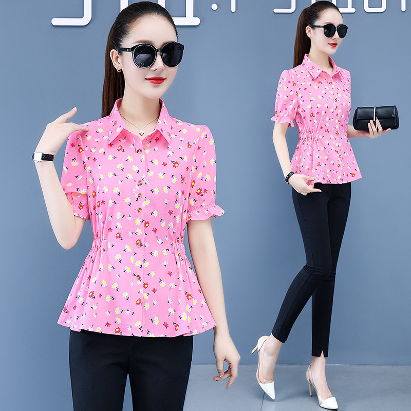 여름 신상 한국 스타일 프린트 셔츠 여성 반팔 상의 슬림핏 쉬폰 셔츠 큰 사이즈 패셔너블 여성 셔츠 도매스토어 가기