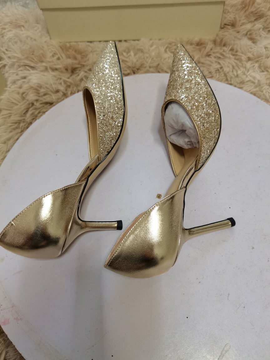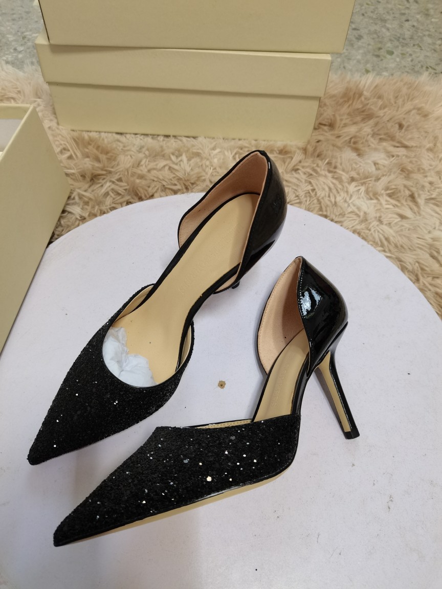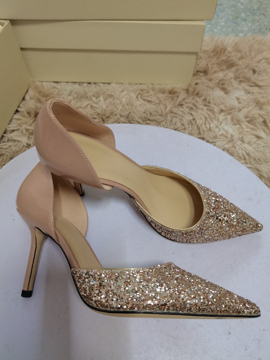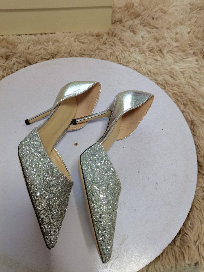봄 2022 지미 웨딩 슈즈 여성용 뾰족한 스티치 가죽 여성 신발 스팽글 우아한 연회 펌프스토어 가기