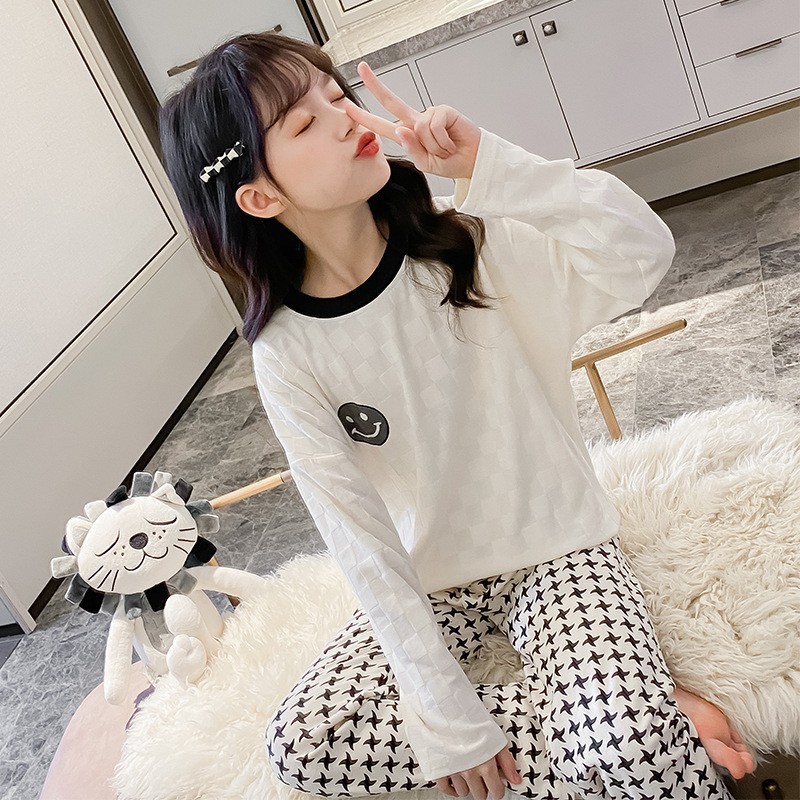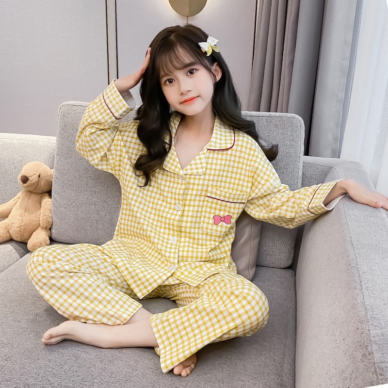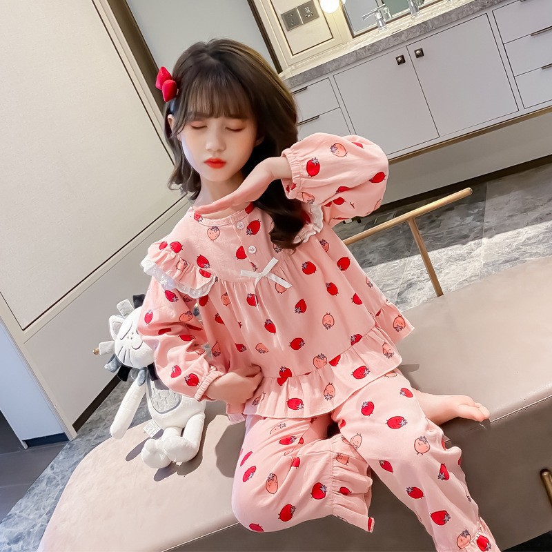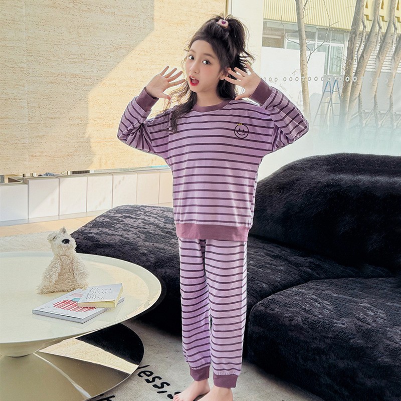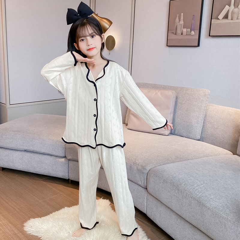 어린이 순수 면화 잠옷 소녀 투피스 트위스트 스트립 세트 2025 가을 새로운 스타일 소녀 단색 가정 의류스토어 가기