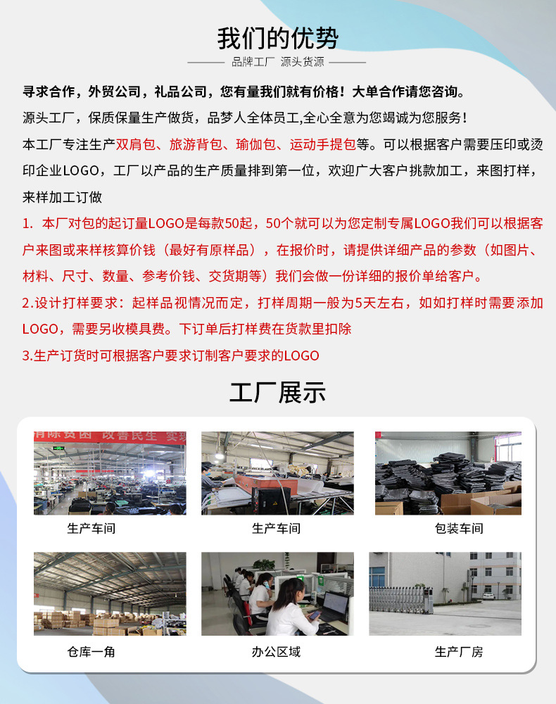 本产品可以定制LOGO,可以为品牌商定制产品。我厂的这款双肩包常年为客户定制。