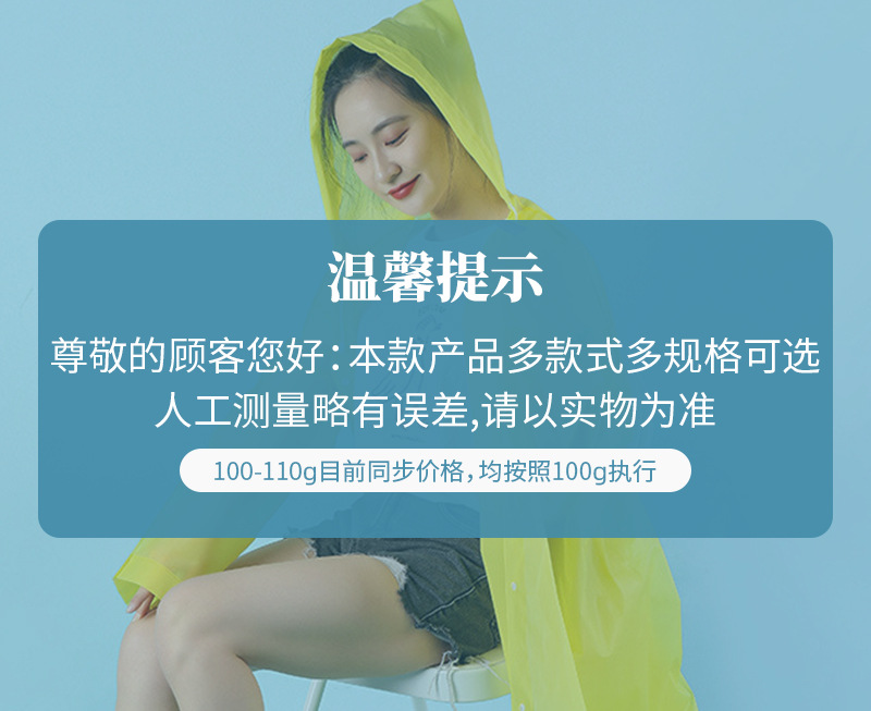 雨衣因为人工裁剪,上下10g公差都是正常现象,如果介意请慎拍,需要特定要求可以咨询客服