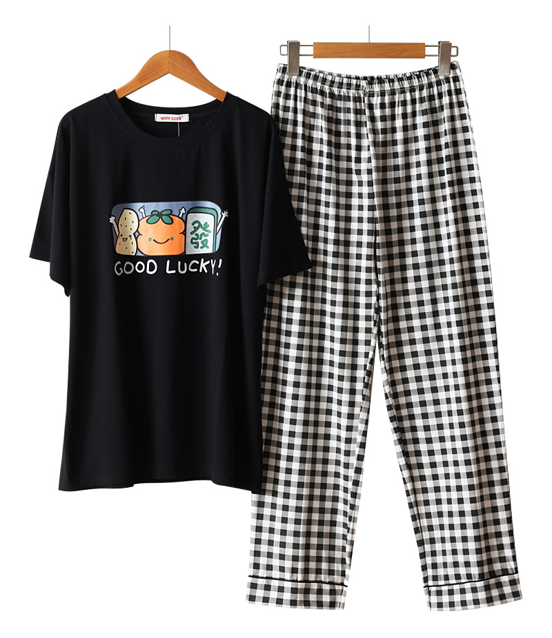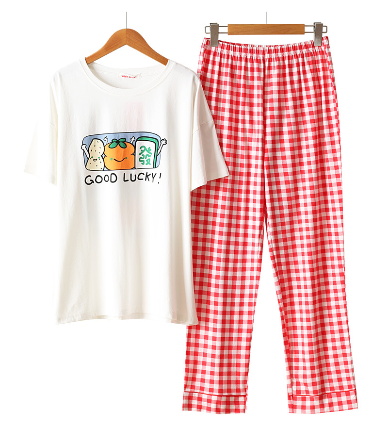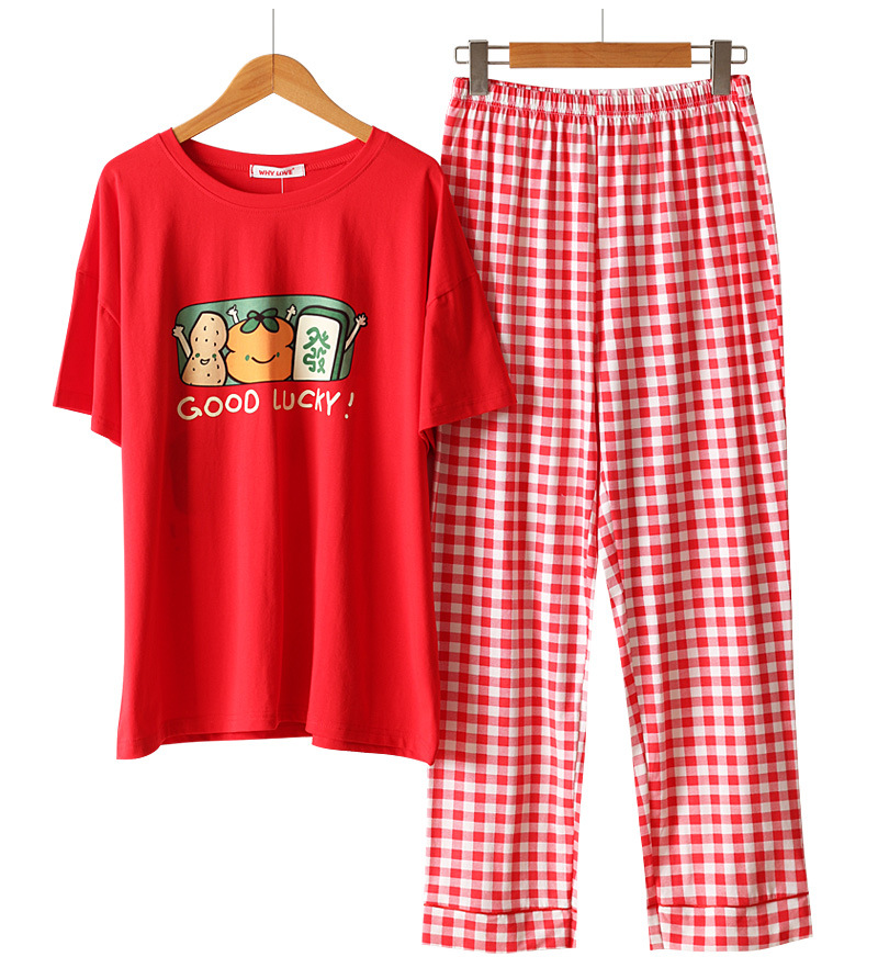 봄과 여름 니트 코튼 커플 잠옷 여성용 반팔 바지 남성용 레드 좋은 감 땅콩 가정복스토어 가기