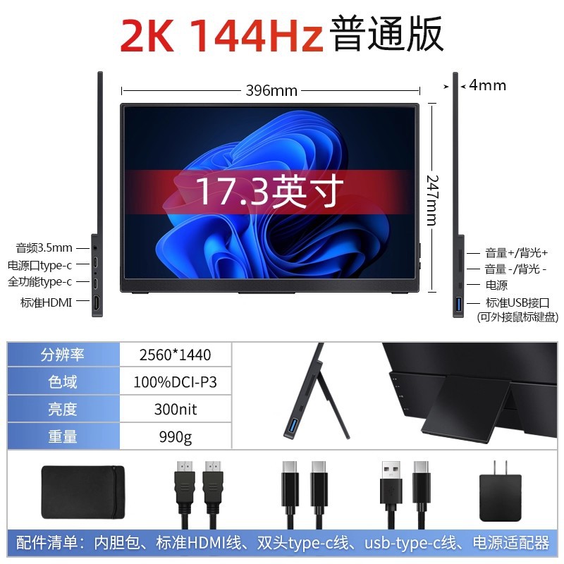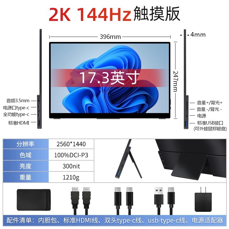 DIY定制 便携式显示器 屏幕 HDR 监视器 液晶 LG TYPE-C线接口 刷新率244Hz 17.3英寸